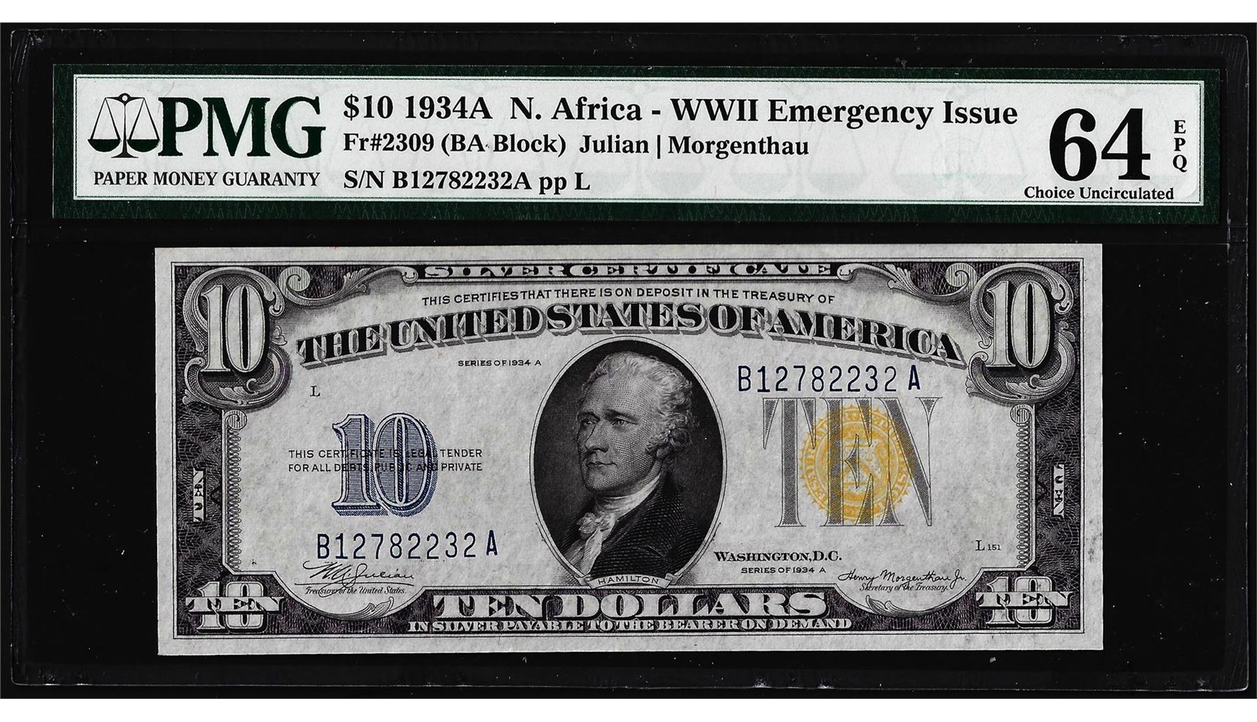 One 1934A $10 North Africa WWII Emergency Issue Silver Certificate Note PMG Ch. Unc 64EPQ. PMG Certified.