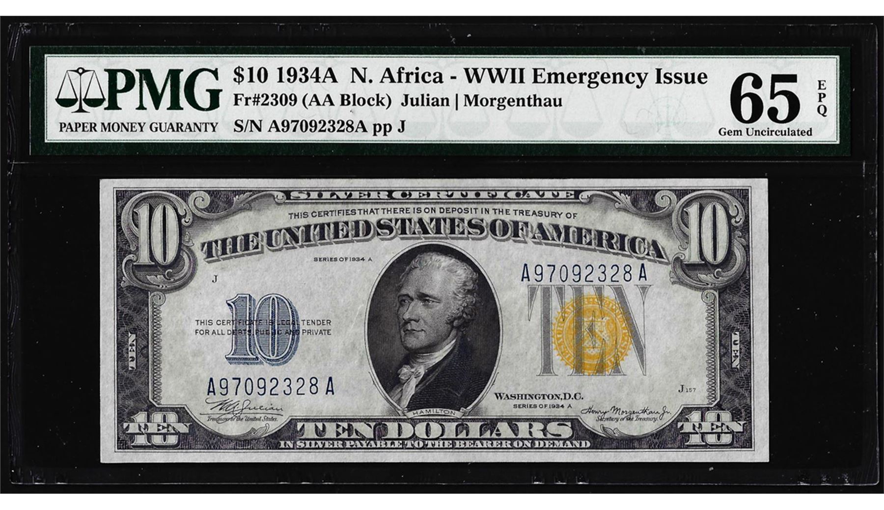 One 1934A $10 North Africa WWII Emergency Issue Silver Certificate Note PMG Gem Unc. 65EPQ. PMG Certified.