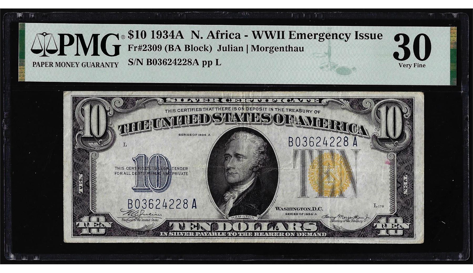 One 1934A $10 North Africa WWII Emergency Issue Silver Certificate Note PMG Very Fine 30. PMG Certified.