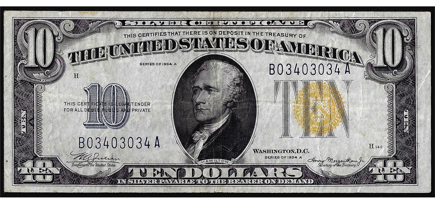One 1934A $10 North Africa WWII Emergency Issue Silver Certificate Note.
