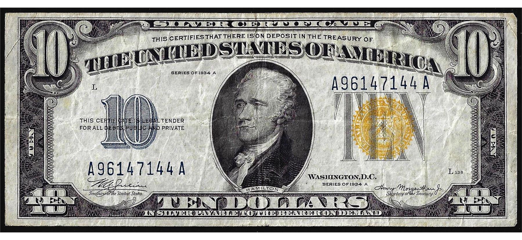One 1934A $10 North Africa WWII Emergency Issue Silver Certificate Note.