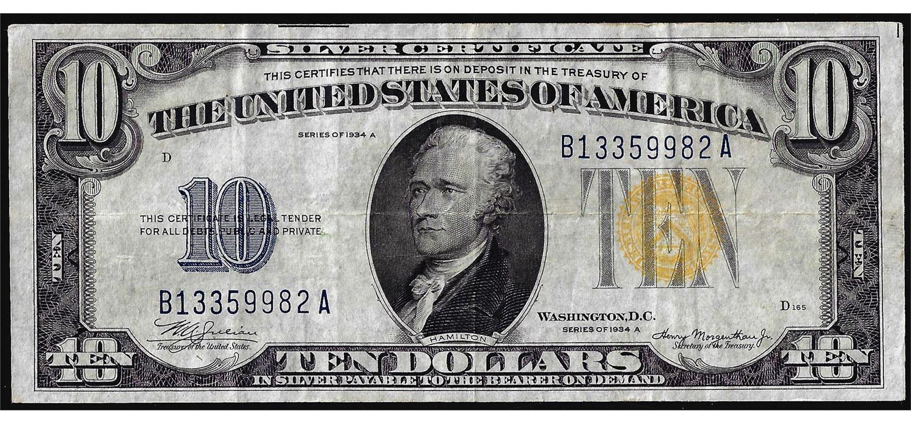 One 1934A $10 North Africa WWII Emergency Issue Silver Certificate Note.