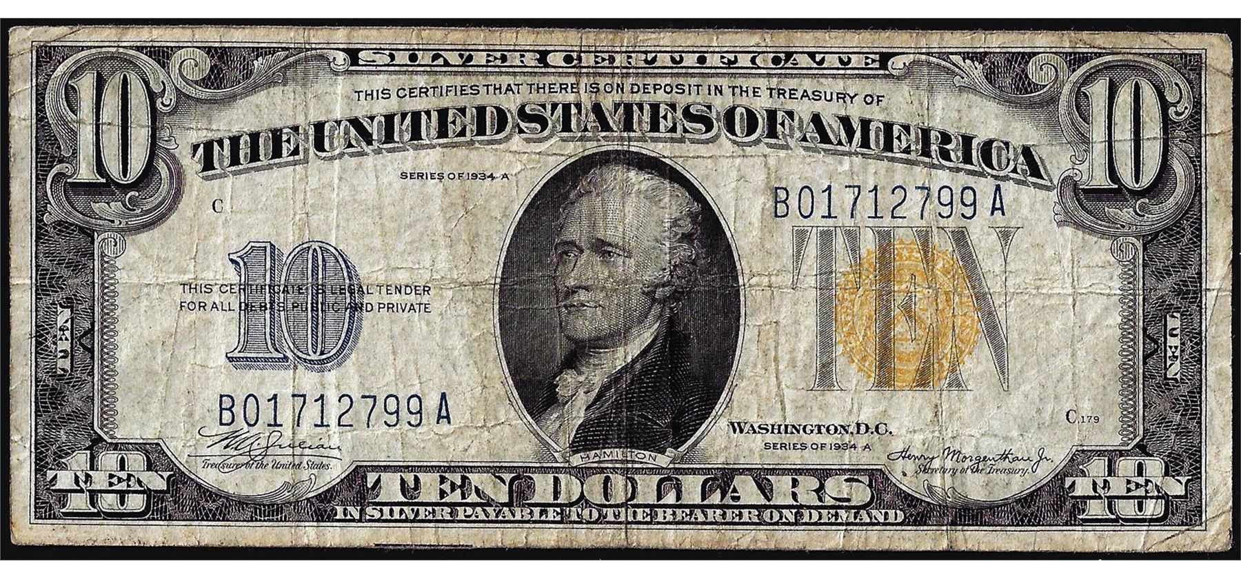 One 1934A $10 North Africa WWII Emergency Issue Silver Certificate Note.