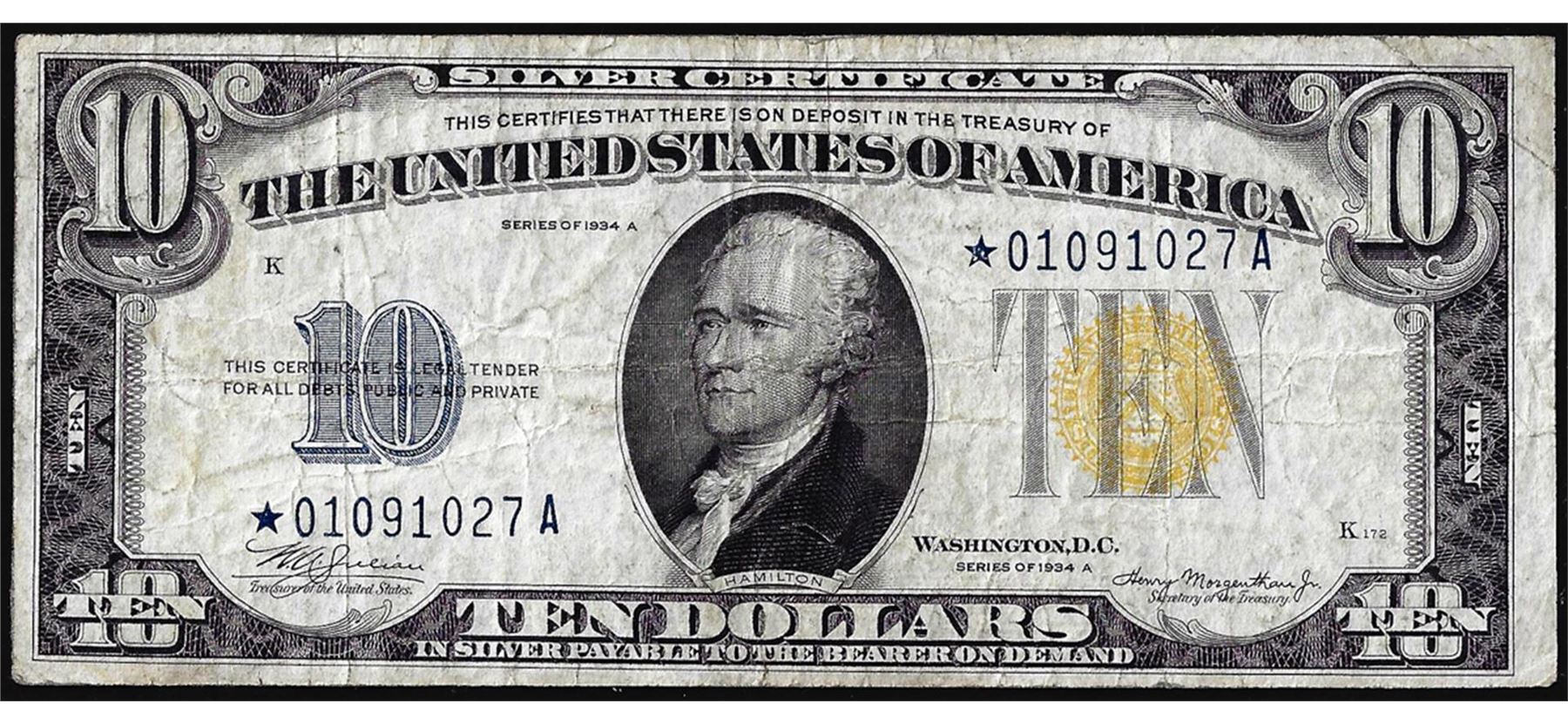 One 1934A $10 North Africa WWII Emergency Issue Silver Certificate STAR Note.