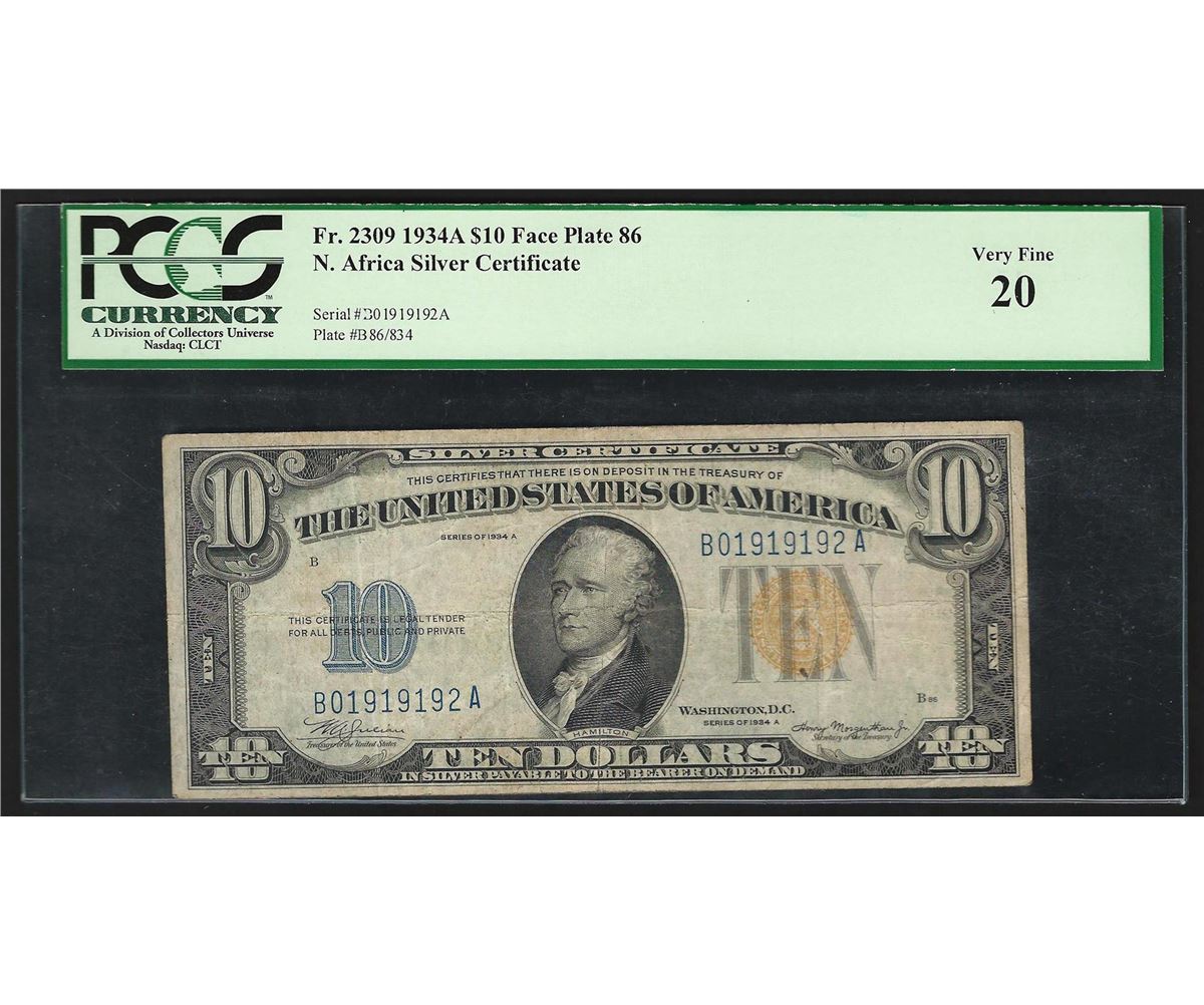 1934A $10 North Africa WWII Emergency Silver Certificate Note PCGS VF20