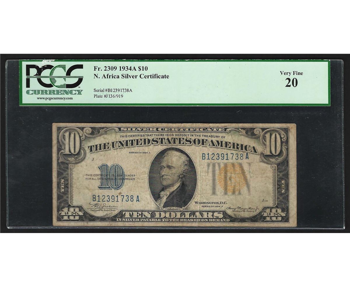 1934A $10 North Africa WWII Emergency Silver Certificate Note PCGS VF20