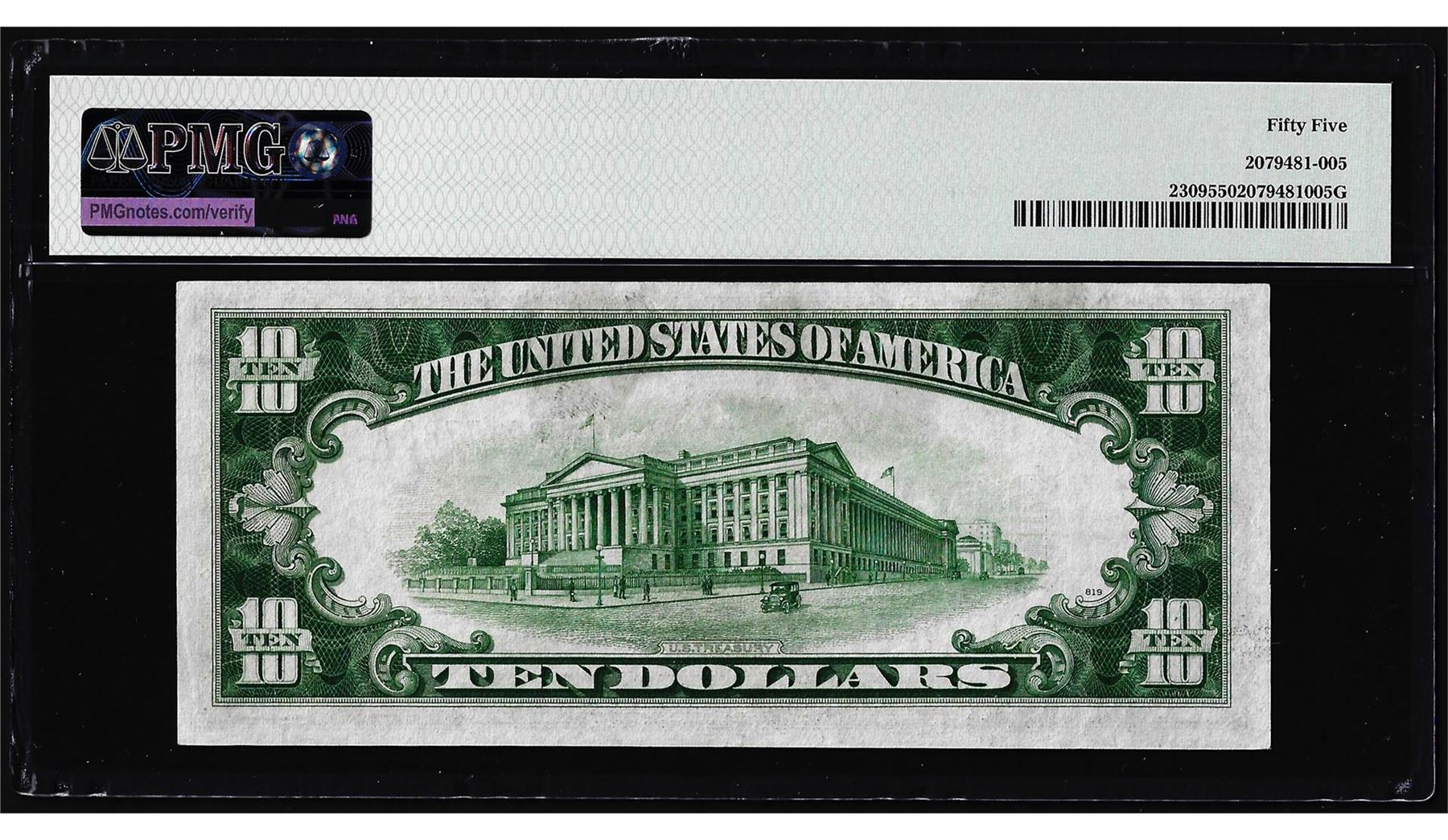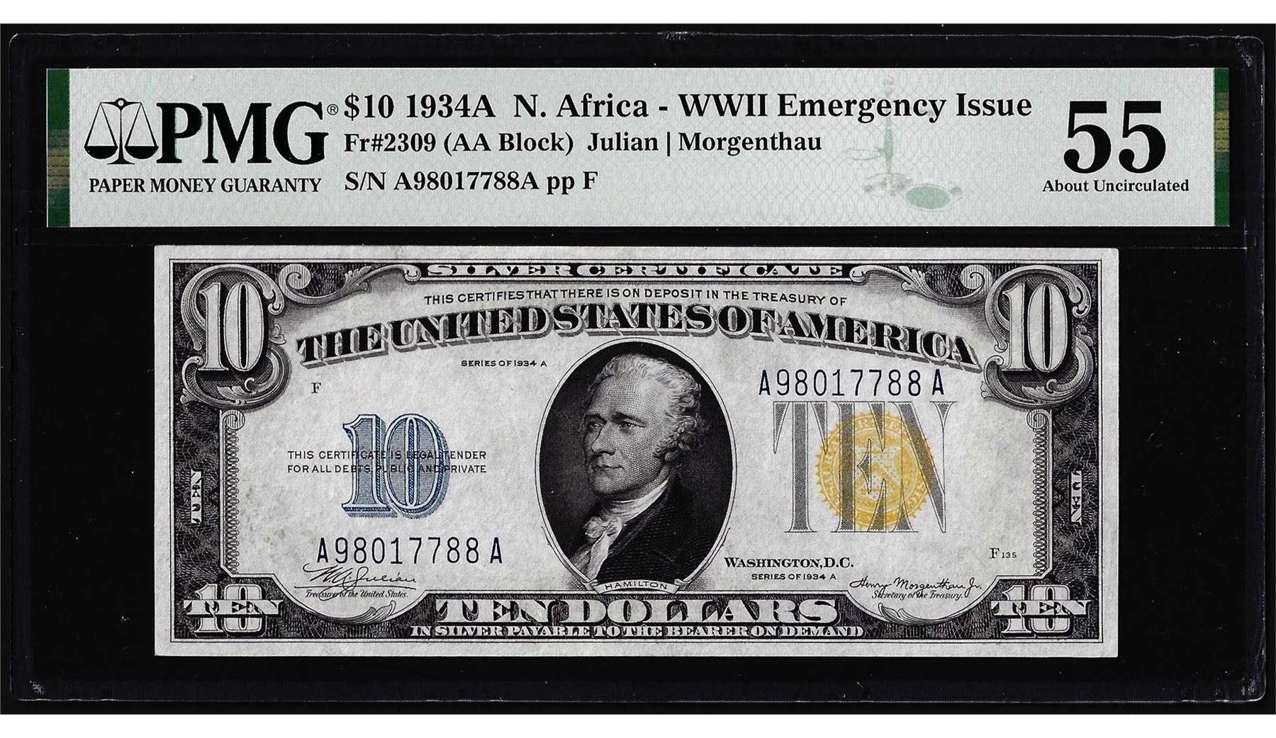 One 1934A $10 North Africa WWII Emergency Silver Certificate Note PMG About Uncirculated 55. PMG Certified.