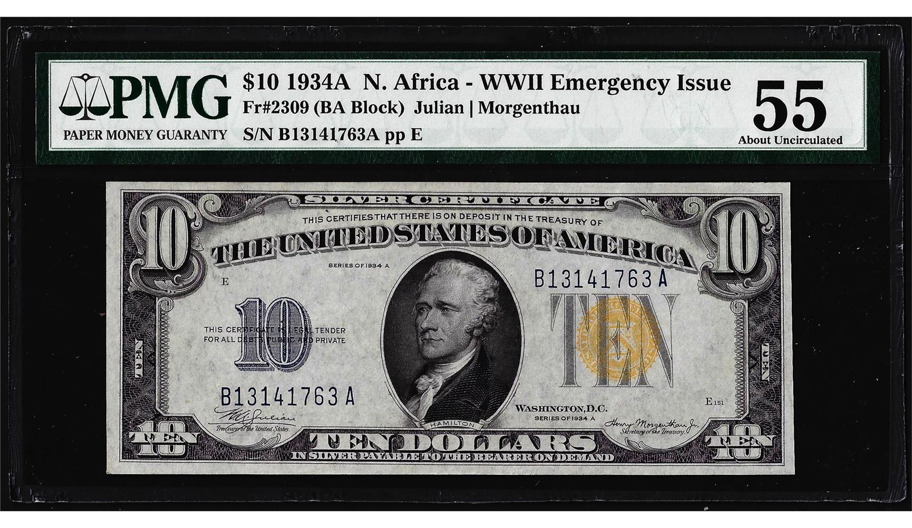 One 1934A $10 North Africa WWII Emergency Silver Certificate Note PMG About Uncirculated 55. PMG Certified.