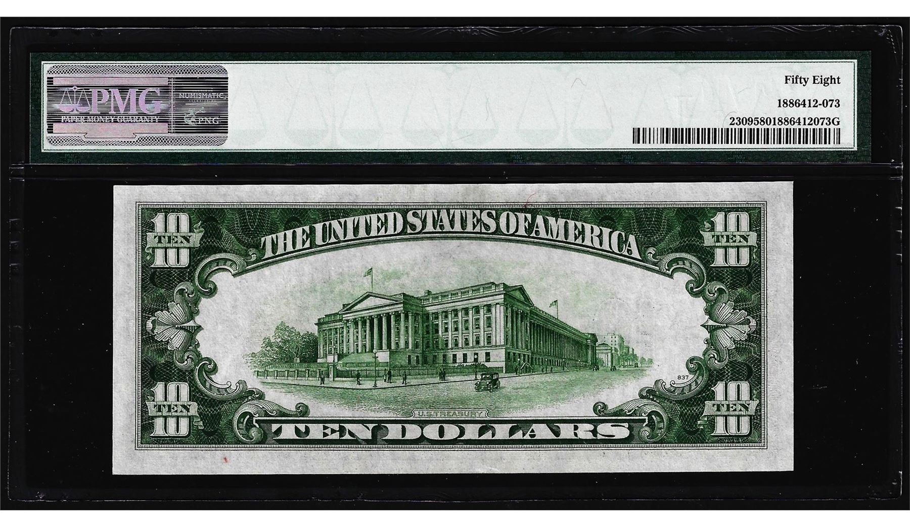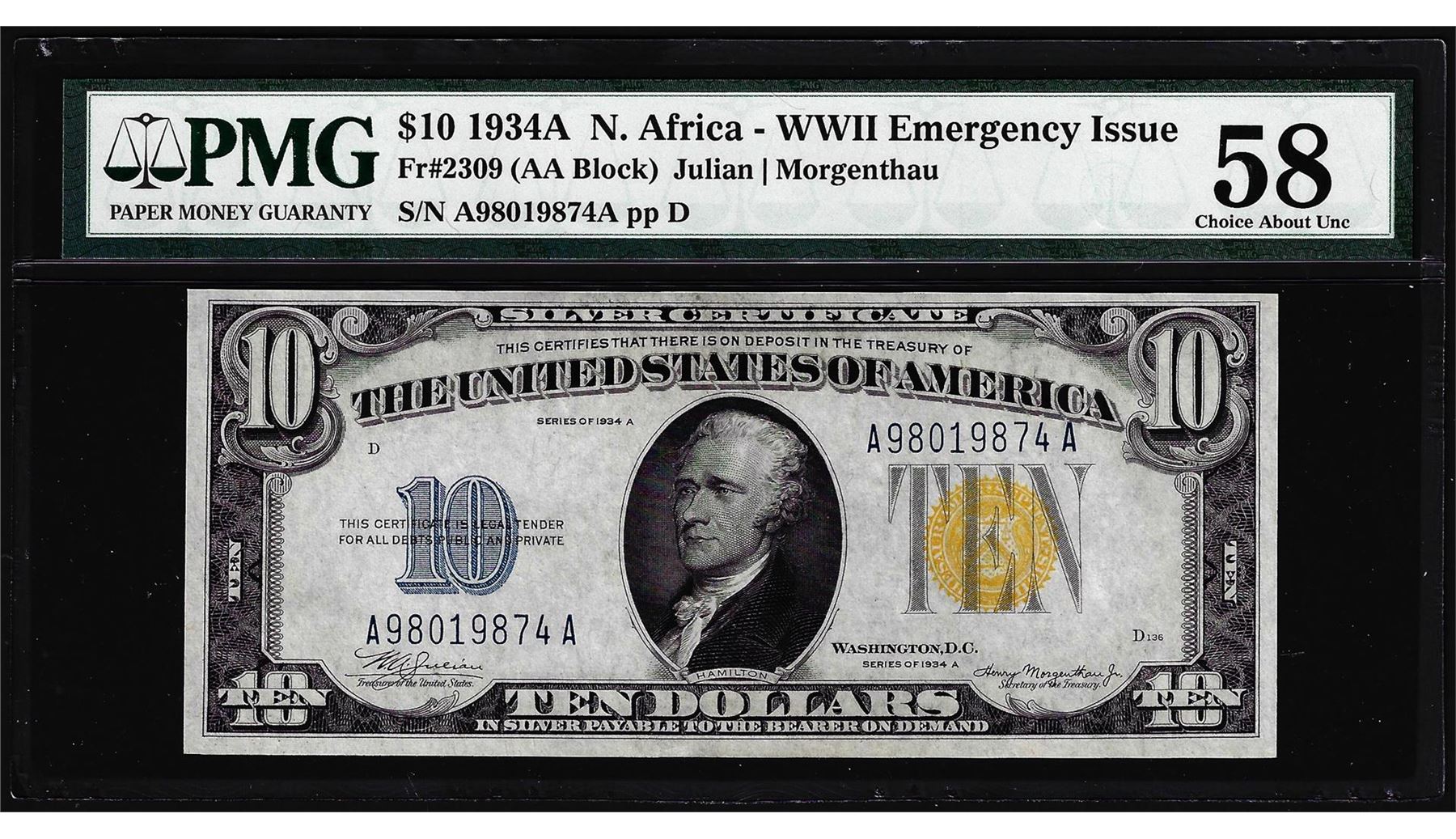 One 1934A $10 North Africa WWII Emergency Silver Certificate Note PMG Ch. About Unc 58. PMG Certified.