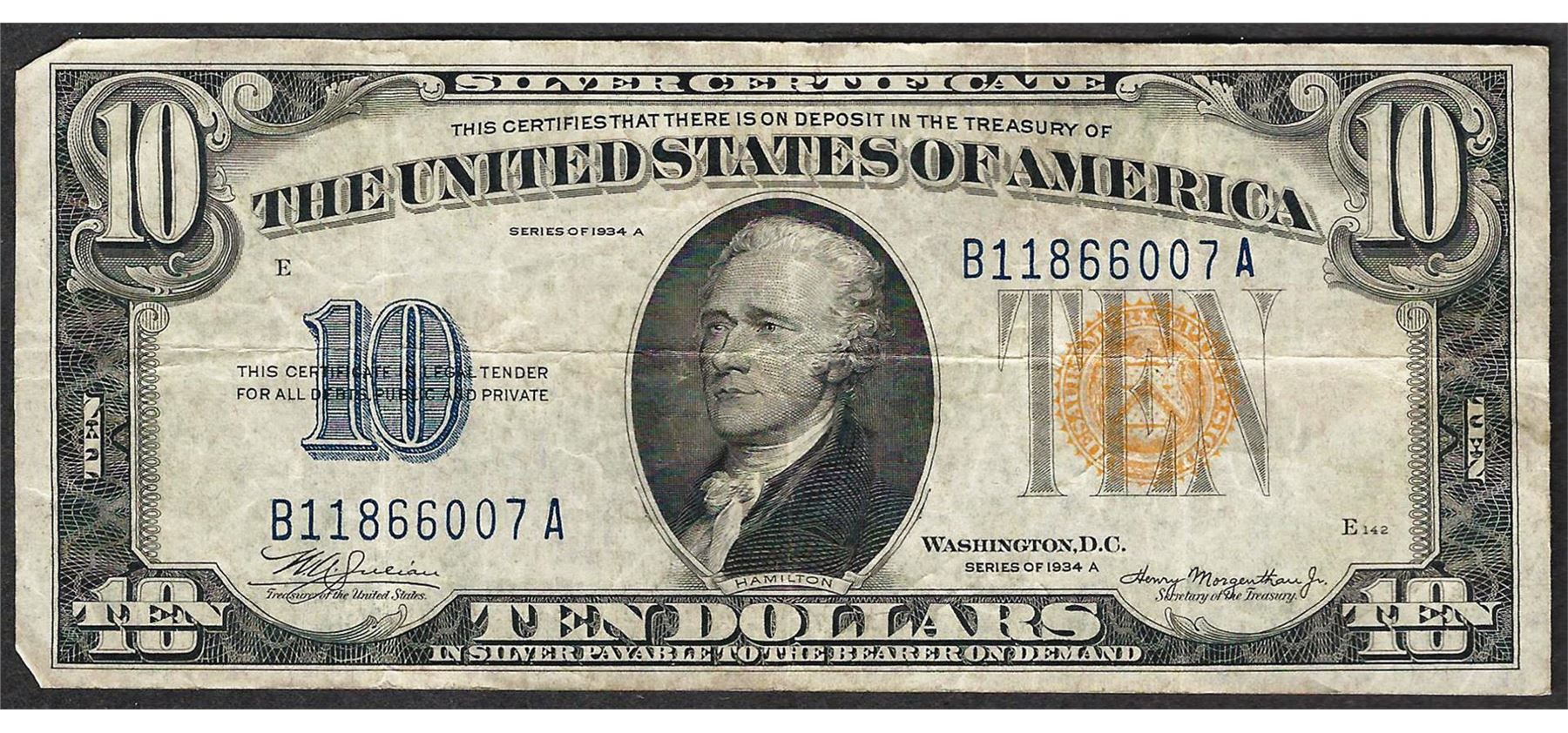 One 1934A $10 North Africa WWII Emergency Silver Certificate Note.