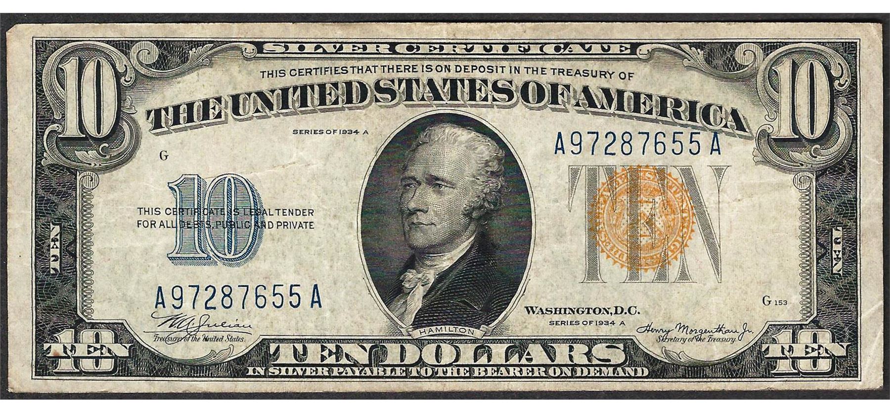 One 1934A $10 North Africa WWII Emergency Silver Certificate Note.