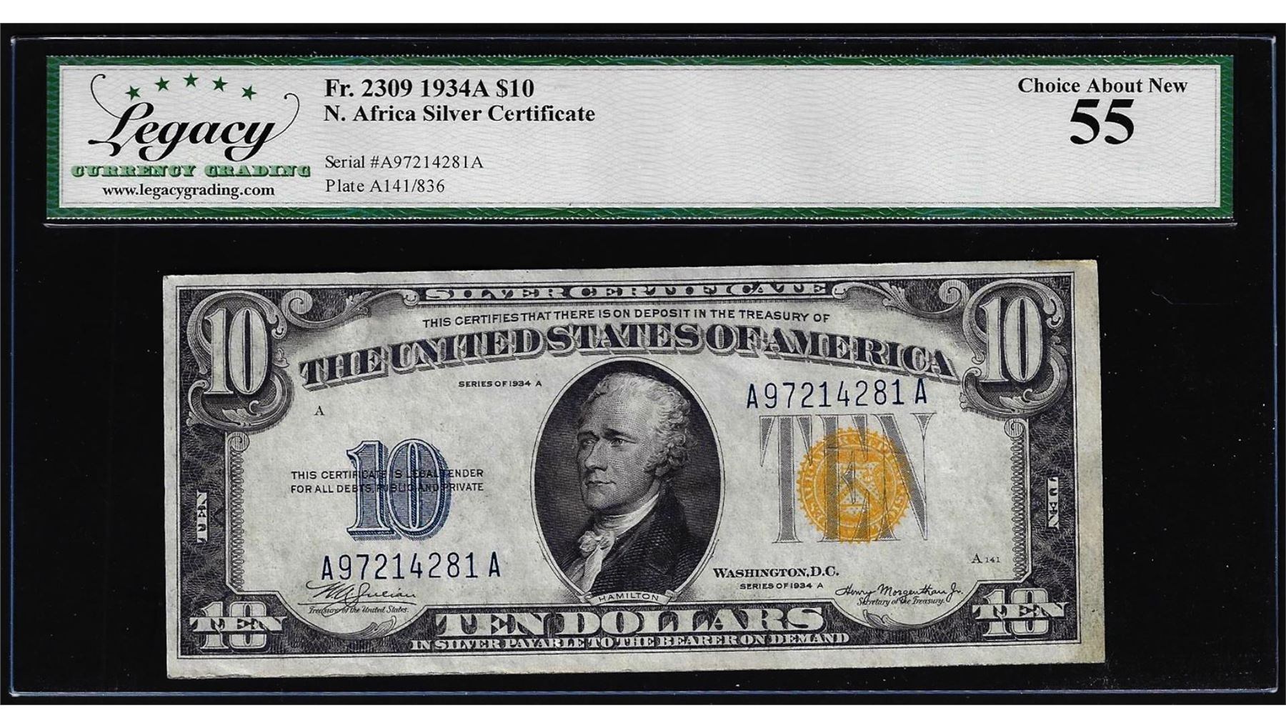 One 1934A $10 North Africa WWII Silver Certificate Note Fr.2309 Legacy Ch. About New 55. Legacy Graded.