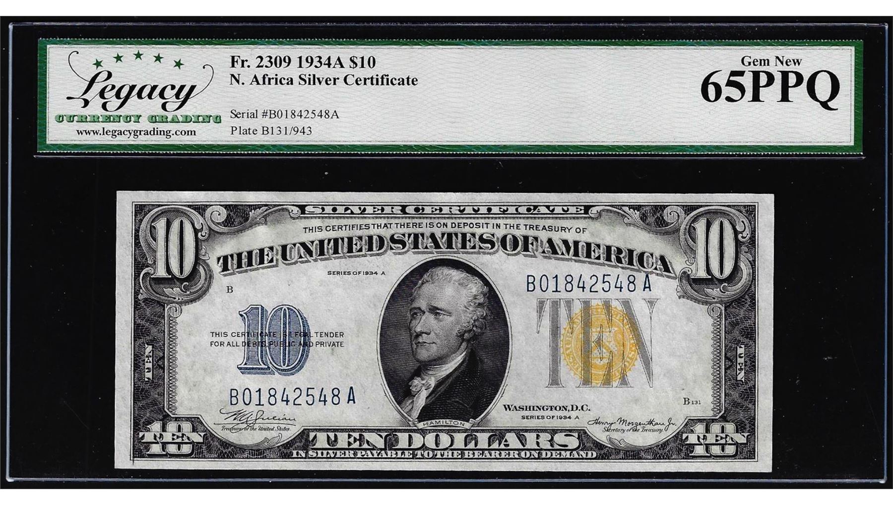 One 1934A $10 North Africa WWII Silver Certificate Note Fr.2309 Legacy Gem New 65PPQ. Legacy Graded.