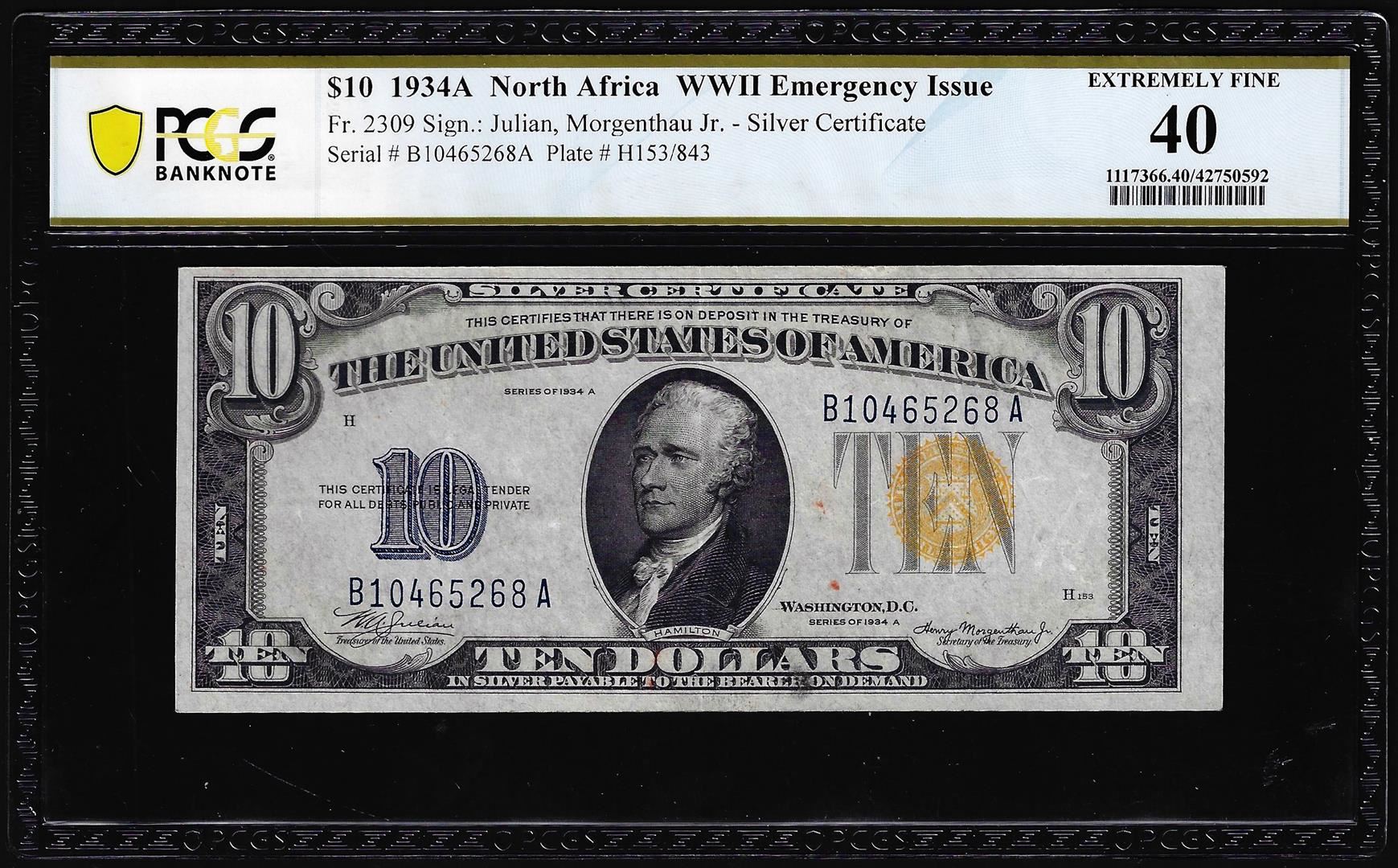 One 1934A $10 North Africa WWII Silver Certificate Note Fr.2309 PCGS Extremely Fine 40. PCGS Graded.