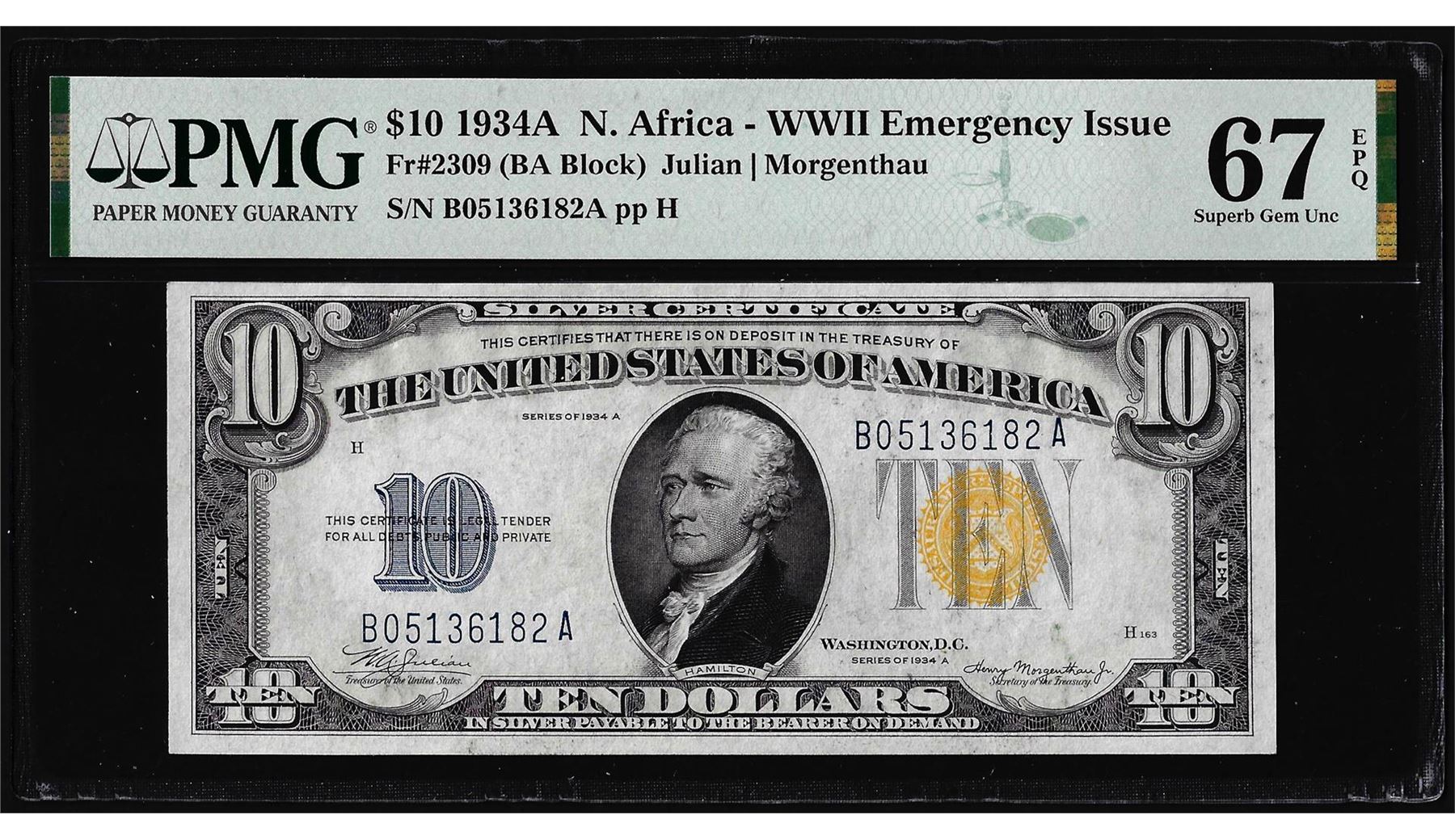 One 1934A $10 North Africa WWII Silver Certificate Note Fr.2309 PMG Superb Gem Uncirculated 67EPQ. PMG Certified.