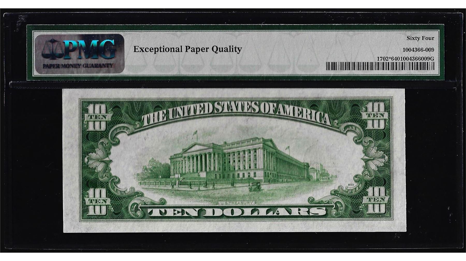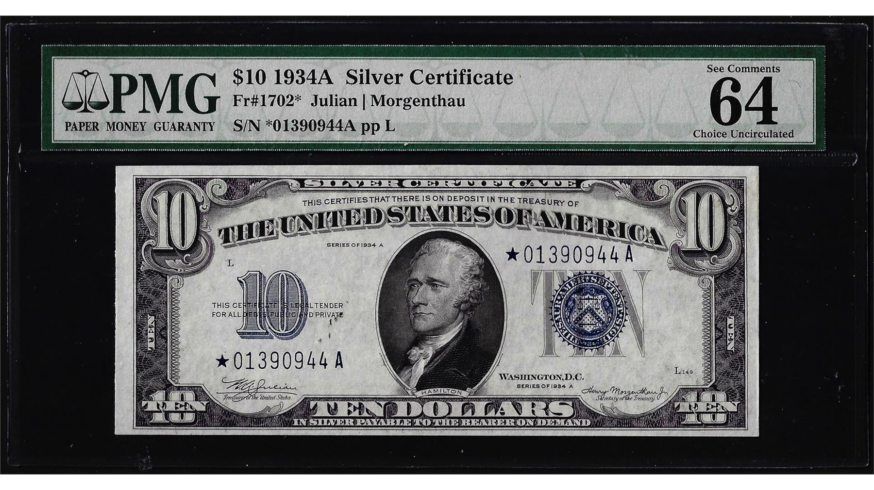 One 1934A $10 Silver Certificate Star Note Fr.1702* PMG Choice Uncirculated 64EPQ. PMG Certified.