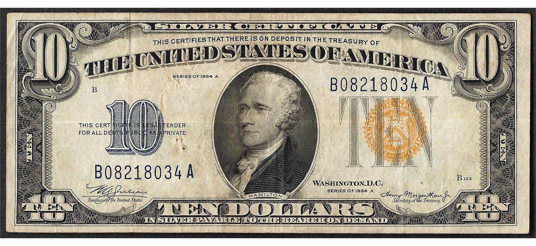 1934A $10 Silver Certificate WWII Emergency North Africa Note Internal Tear