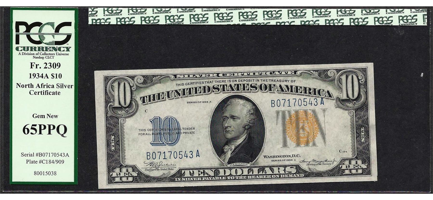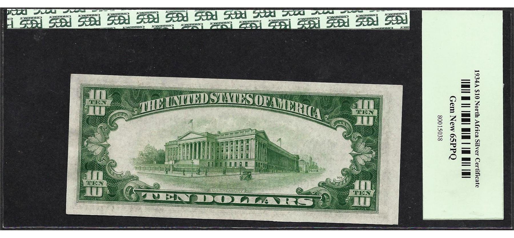 1934A $10 Silver Certificate WWII Emergency North Africa Note PCGS Gem New 65PPQ