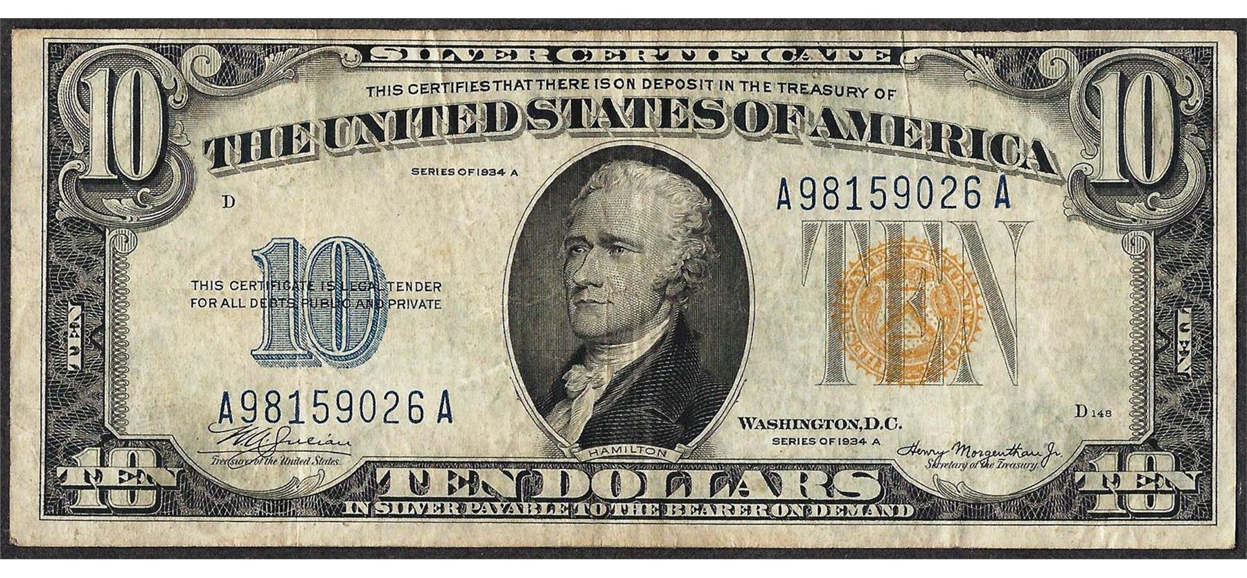 One 1934A $10 Silver Certificate WWII Emergency North Africa Note.