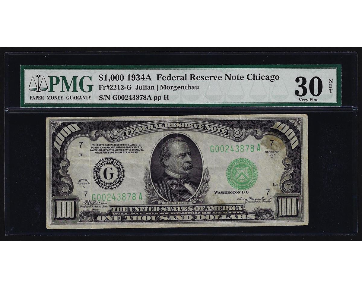One 1934A $1000 Federal Reserve Note Chicago PMG VF30 Net. PMG Certified.