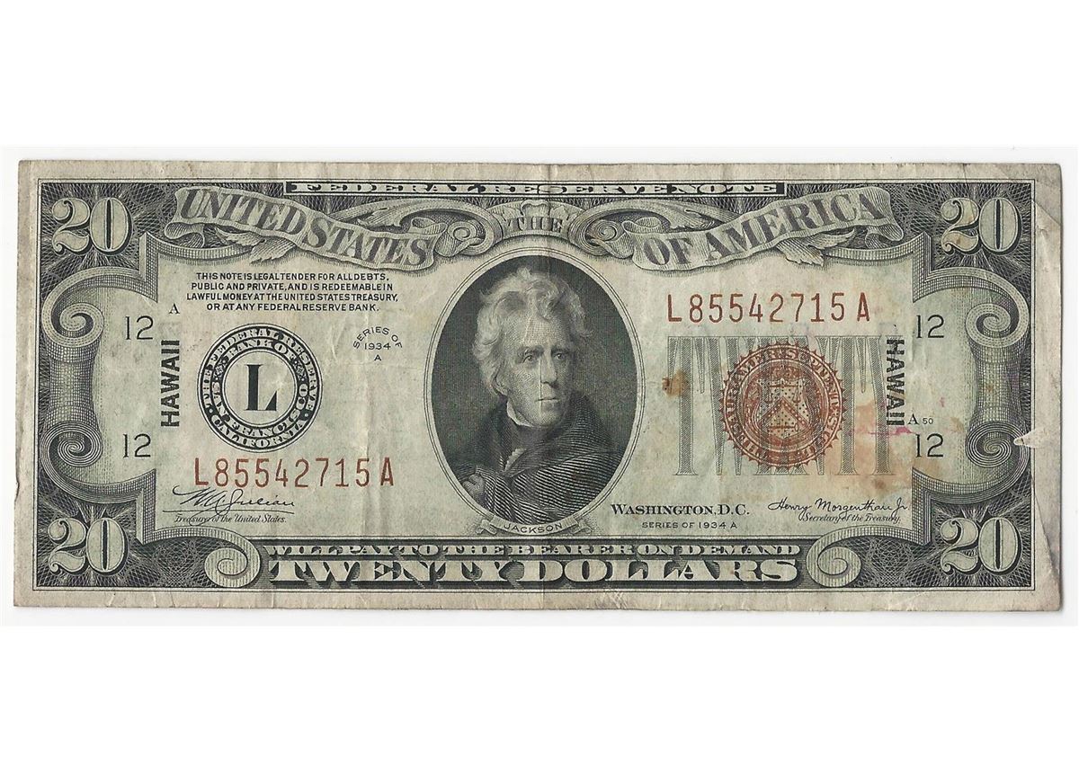 One 1934A $20 Federal Reserve Emergency Hawaii Note.