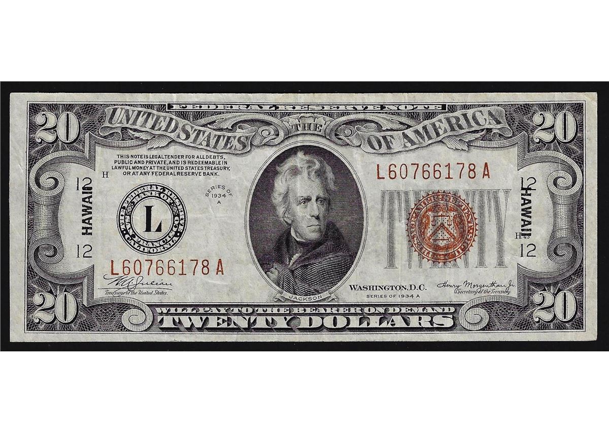 One 1934A $20 Federal Reserve Emergency Hawaii Note.
