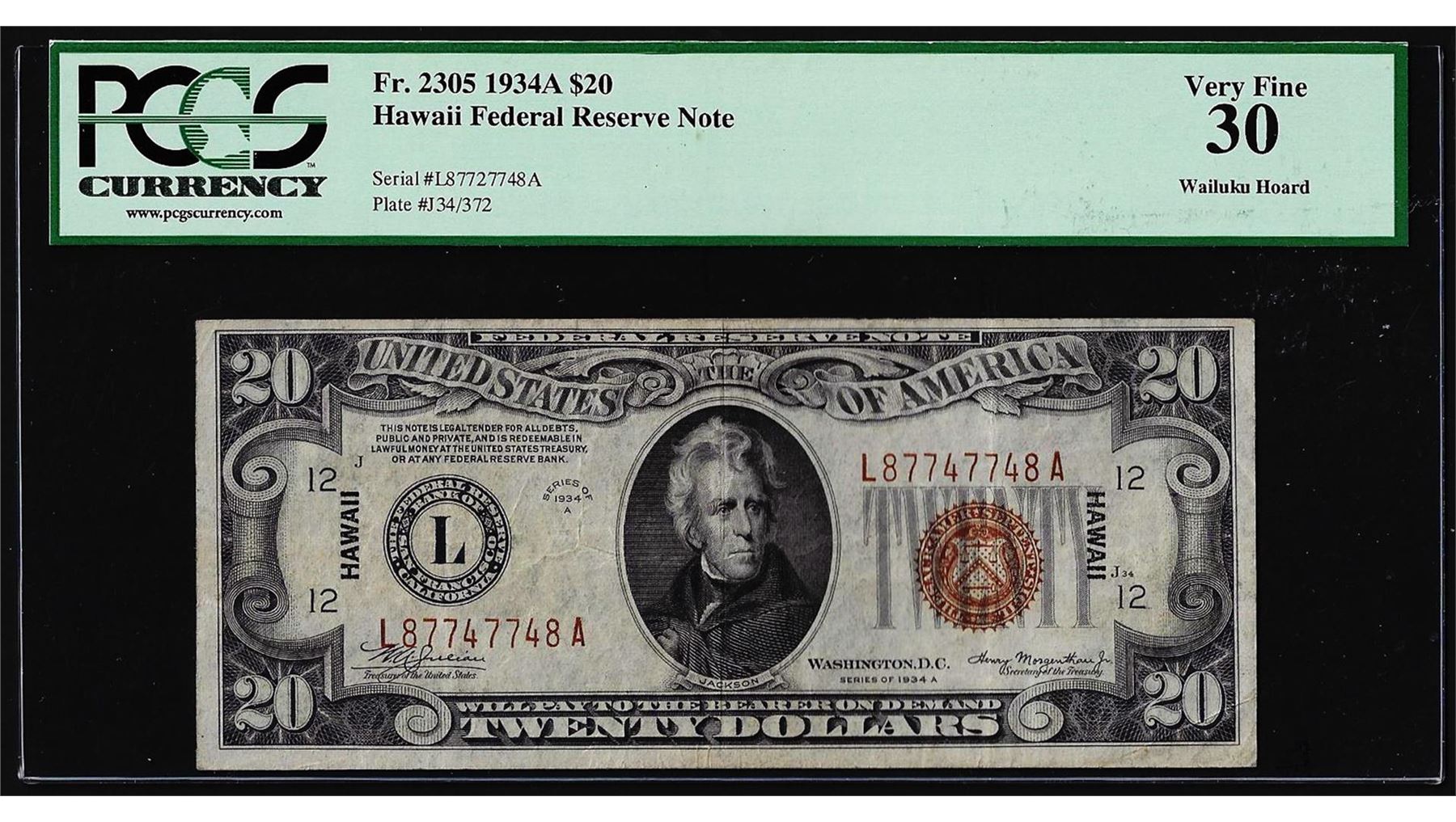One 1934A $20 Hawaii Federal Reserve Note WWII Emergency Note PCGS Very Fine 30. PCGS Graded.