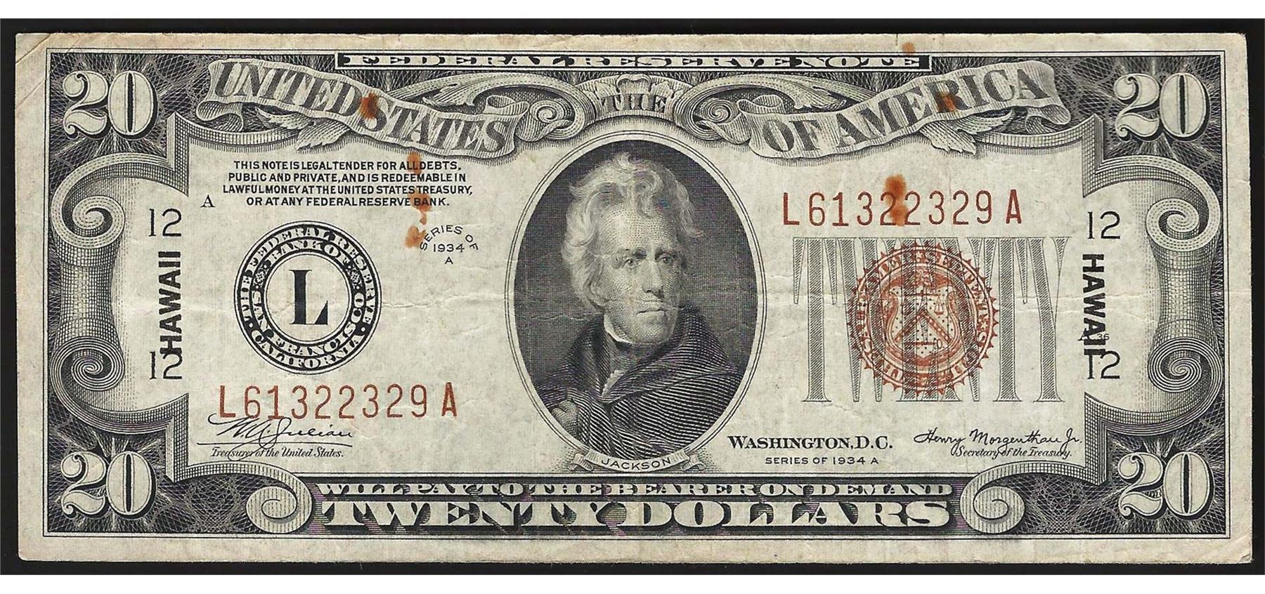 One 1934A $20 Hawaii Federal Reserve Note WWII Emergency Note.