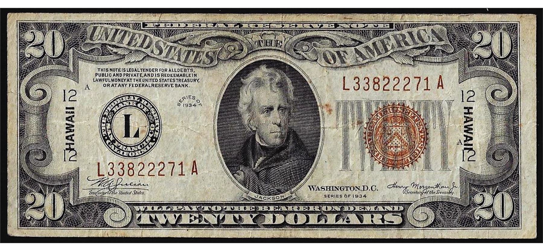 One 1934A $20 Hawaii Federal Reserve Note WWII Emergency Note.