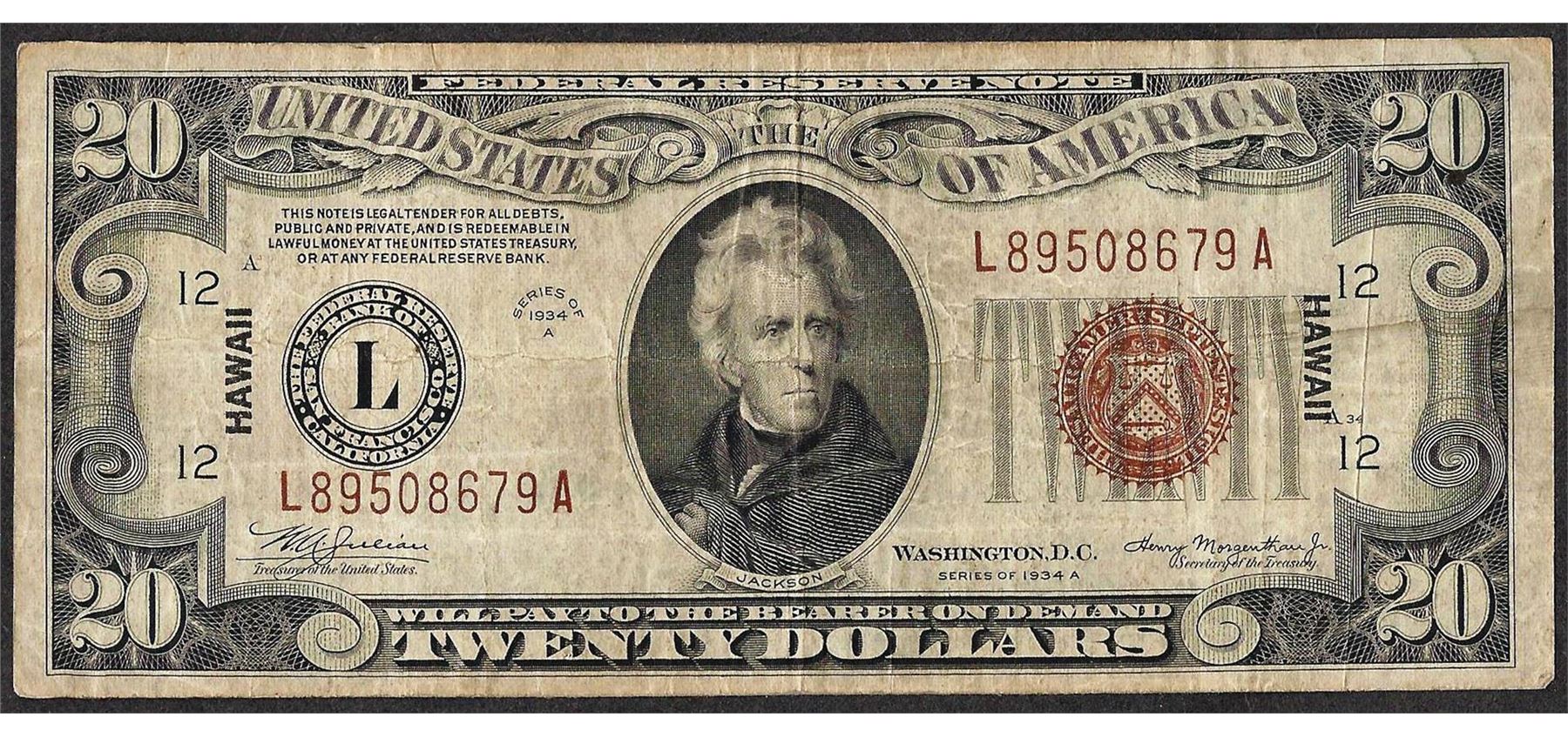 One 1934A $20 Hawaii WWII Emergency Federal Reserve Note.