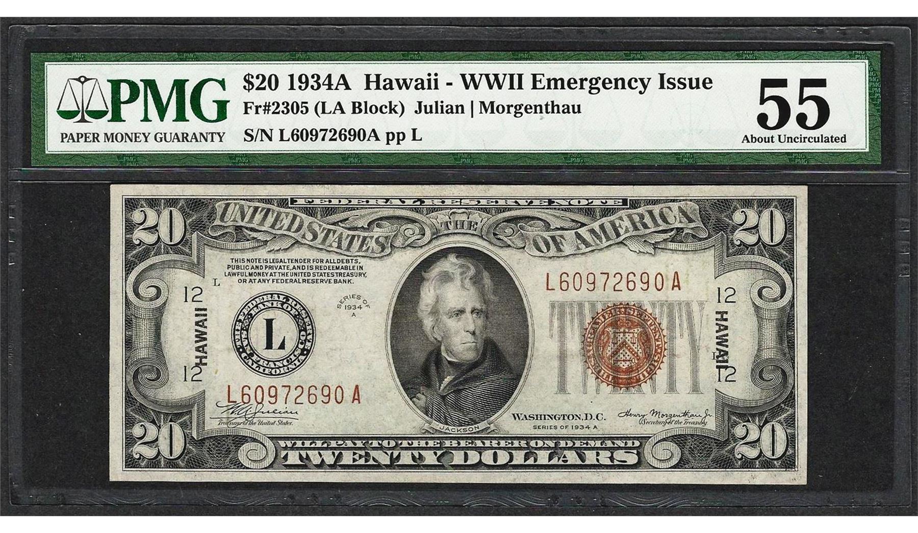One 1934A $20 Hawaii WWII Emergency Issue Federal Reserve Note PMG About Uncirculated 55. PMG Certified.