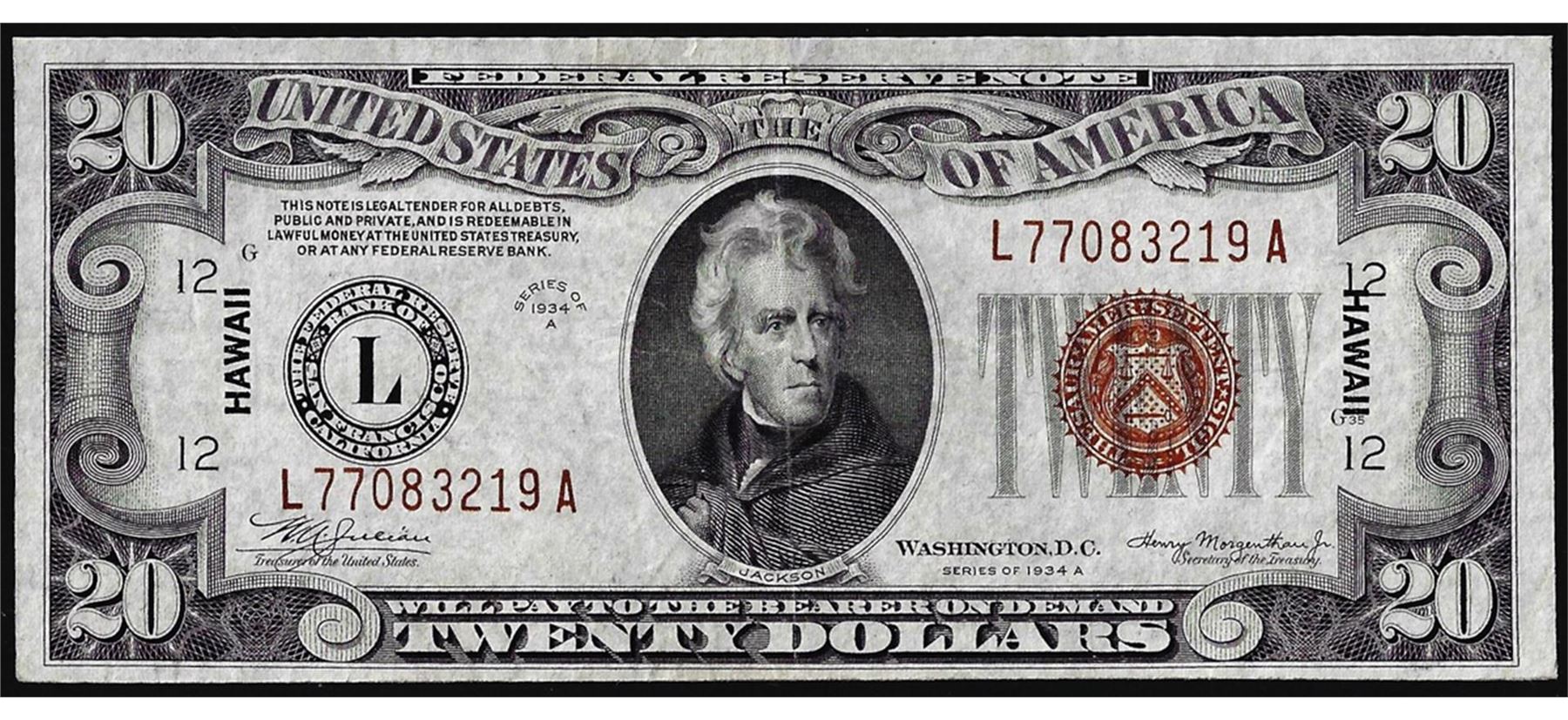 One 1934A $20 Hawaii WWII Emergency Issue Federal Reserve Note.