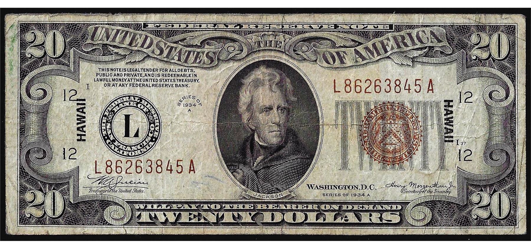 One 1934A $20 Hawaii WWII Emergency Issue Federal Reserve Note.
