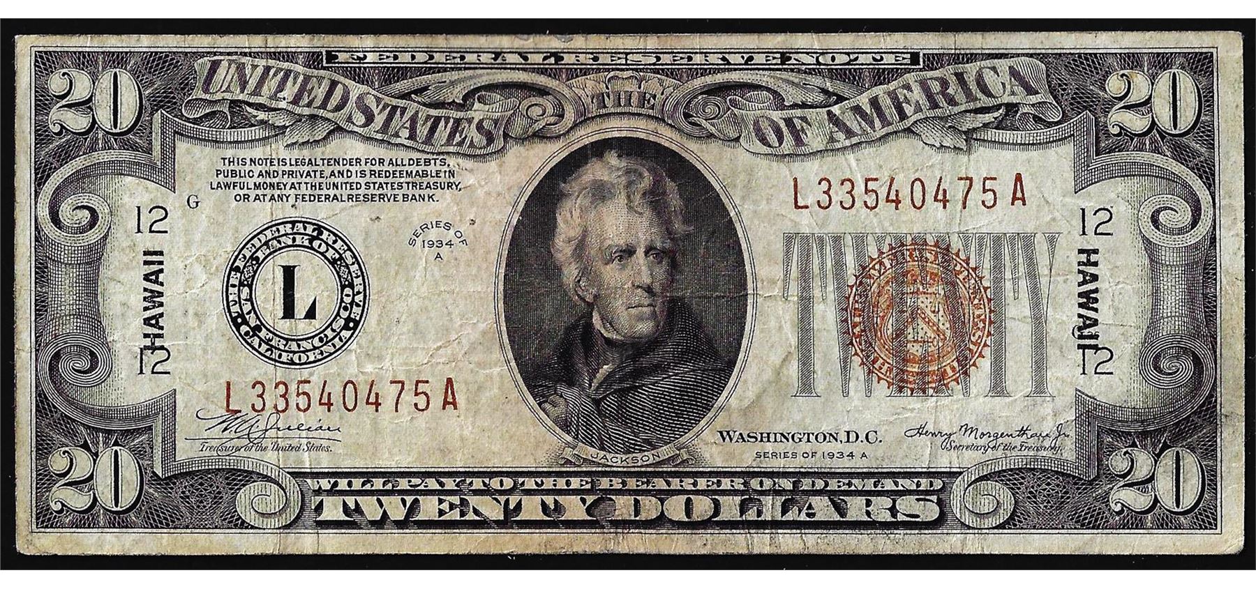 One 1934A $20 Hawaii WWII Emergency Issue Federal Reserve Note.