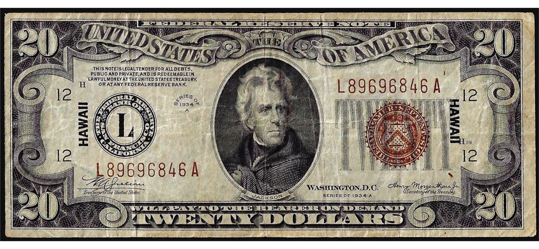 One 1934A $20 Hawaii WWII Emergency Issue Federal Reserve Note.