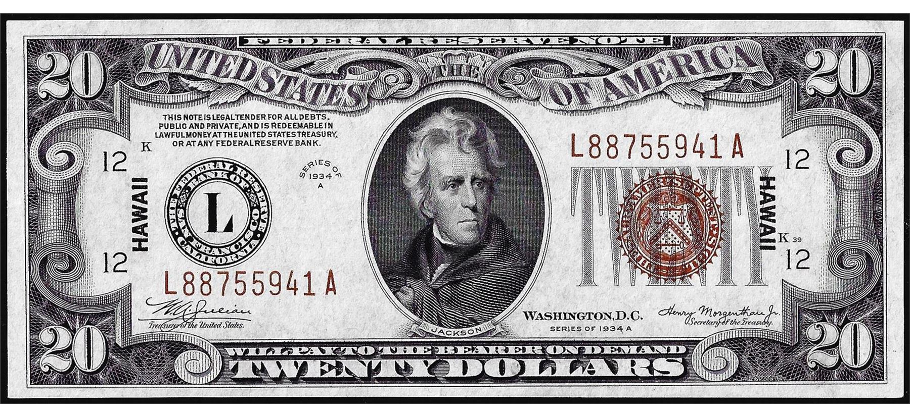 One 1934A $20 Hawaii WWII Emergency Issue Federal Reserve Note.