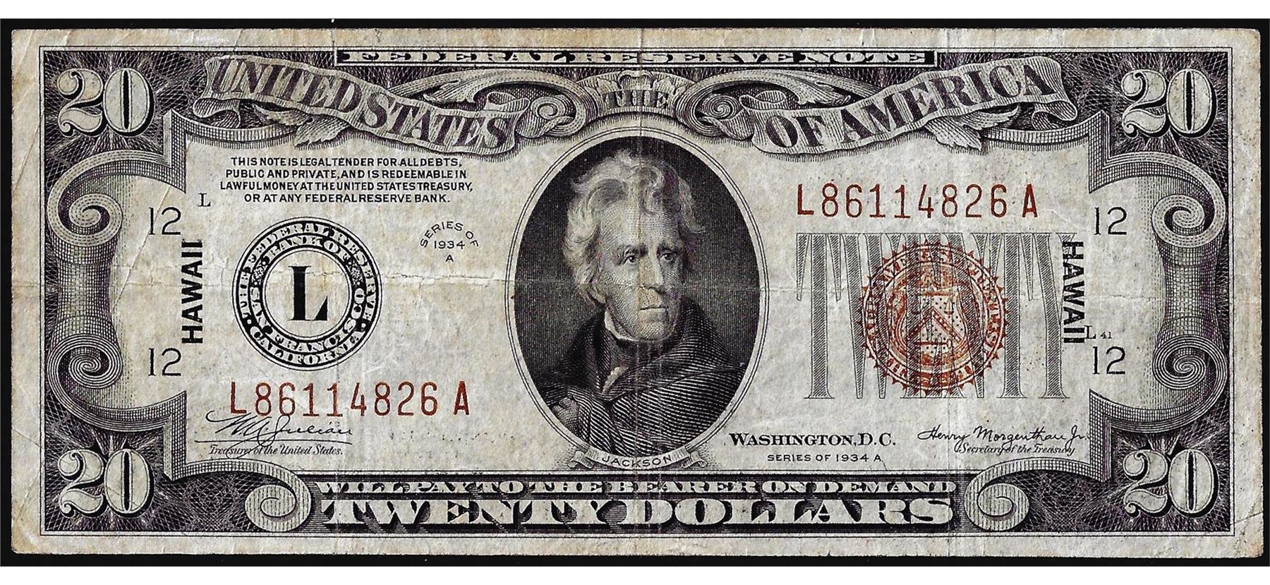One 1934A $20 Hawaii WWII Emergency Issue Federal Reserve Note.