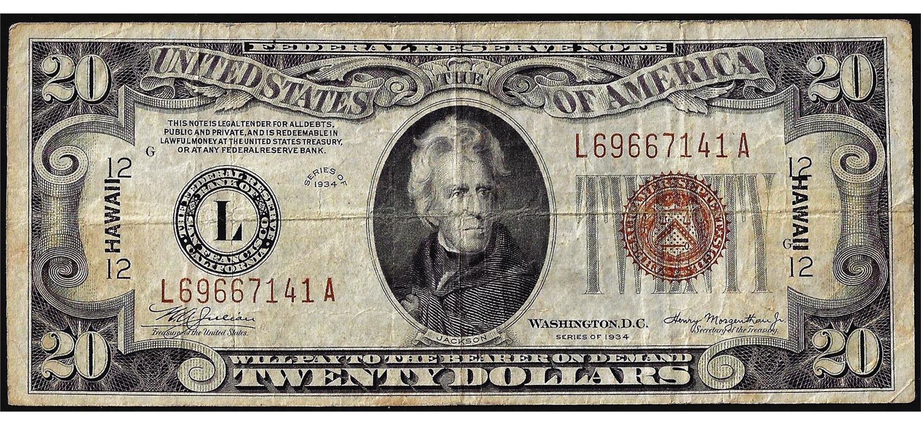 One 1934A $20 Hawaii WWII Emergency Issue Federal Reserve Note.