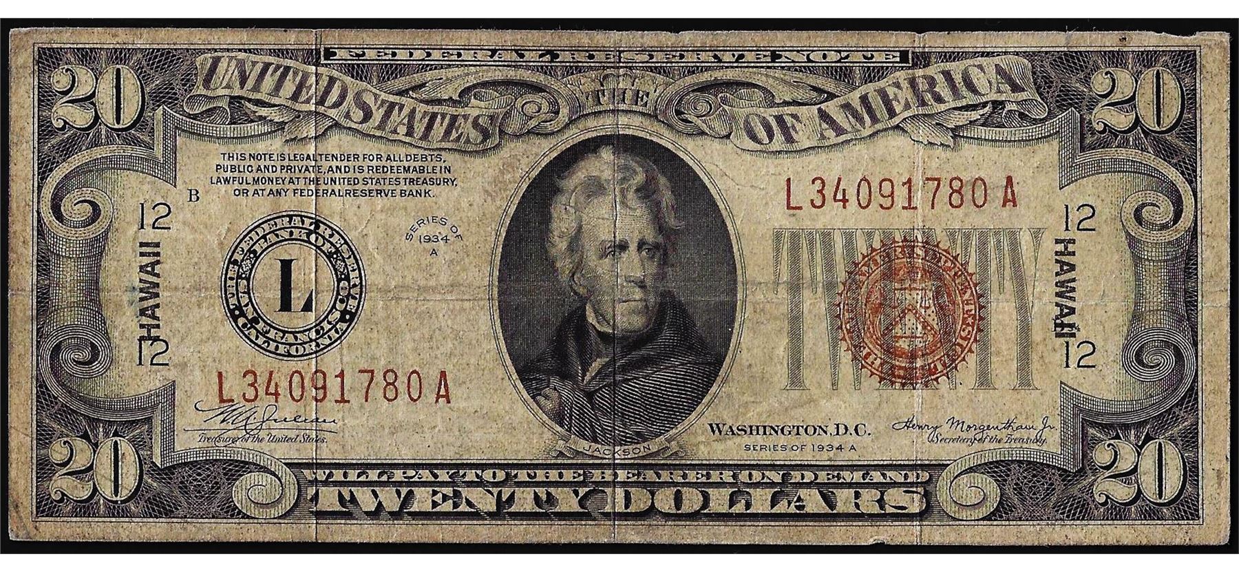 One 1934A $20 Hawaii WWII Emergency Issue Federal Reserve Note.