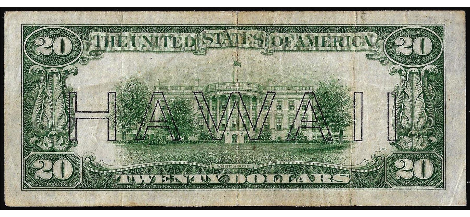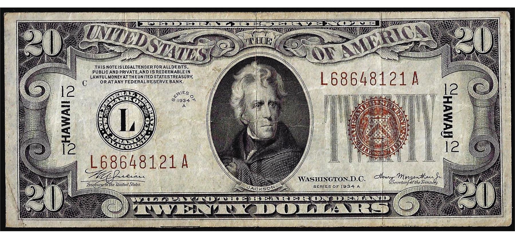 One 1934A $20 Hawaii WWII Emergency Issue Federal Reserve Note.