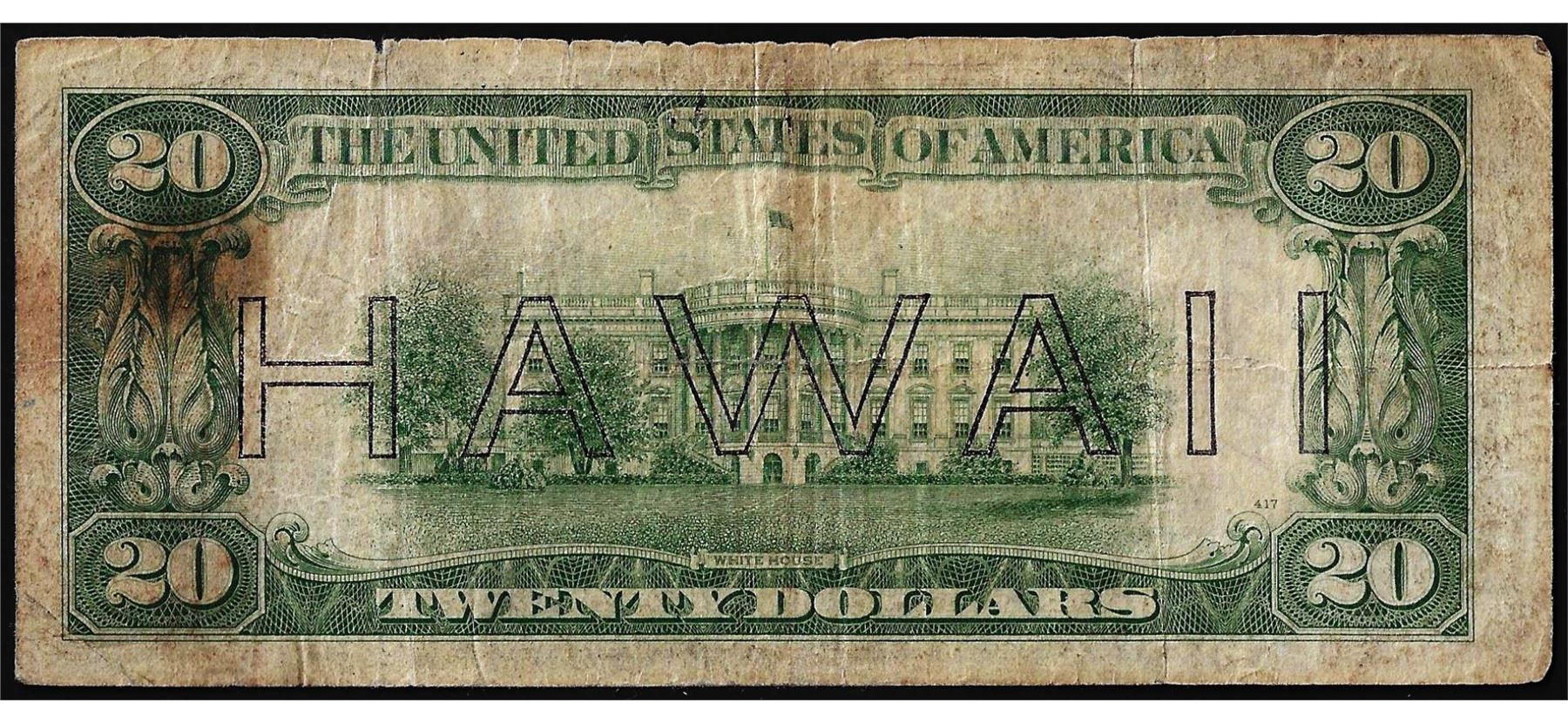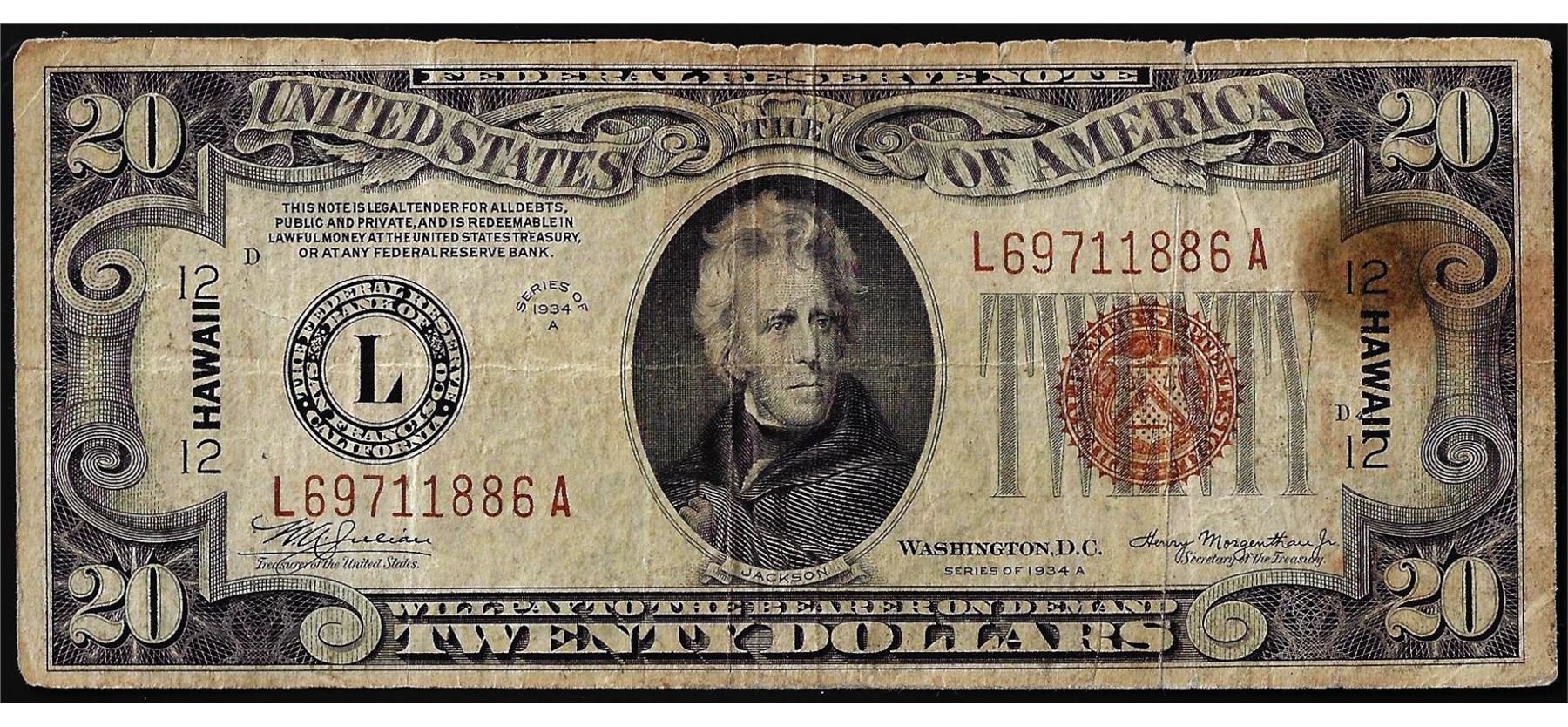 One 1934A $20 Hawaii WWII Emergency Issue Federal Reserve Note.