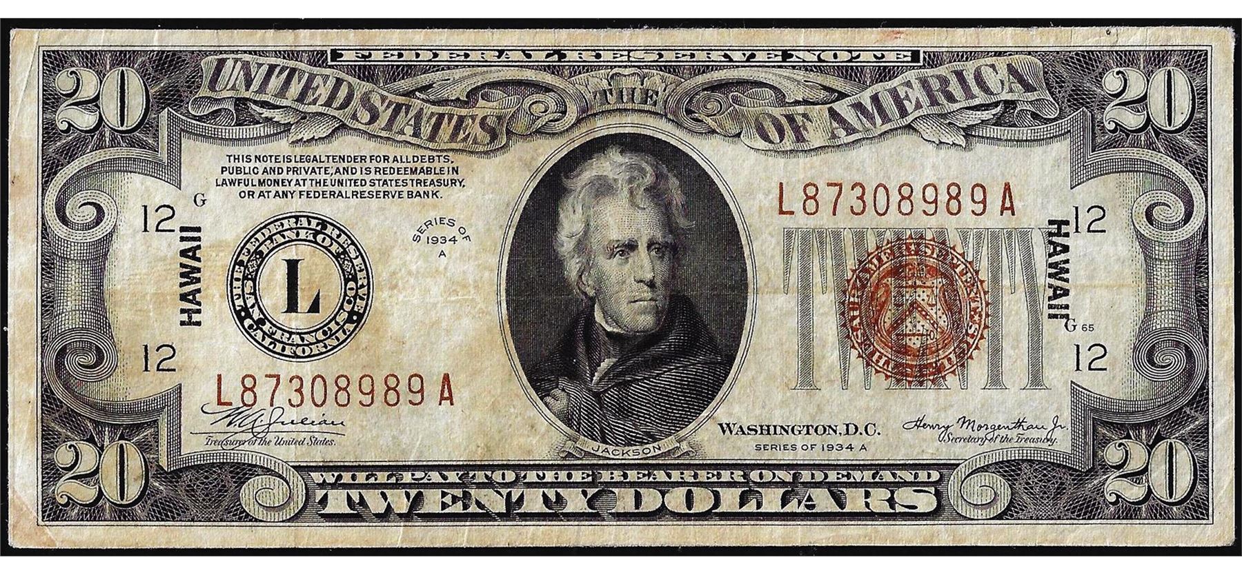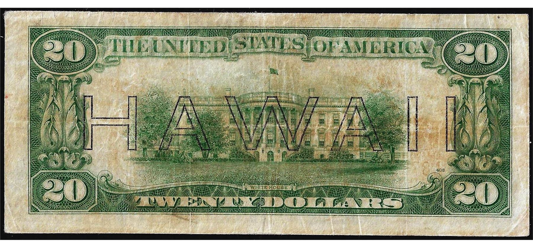 One 1934A $20 Hawaii WWII Emergency Issue Federal Reserve Note.