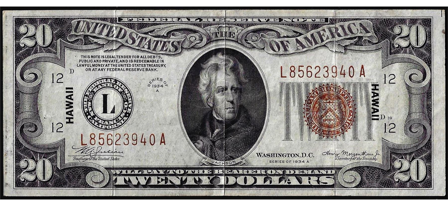 One 1934A $20 Hawaii WWII Emergency Issue Federal Reserve Note.