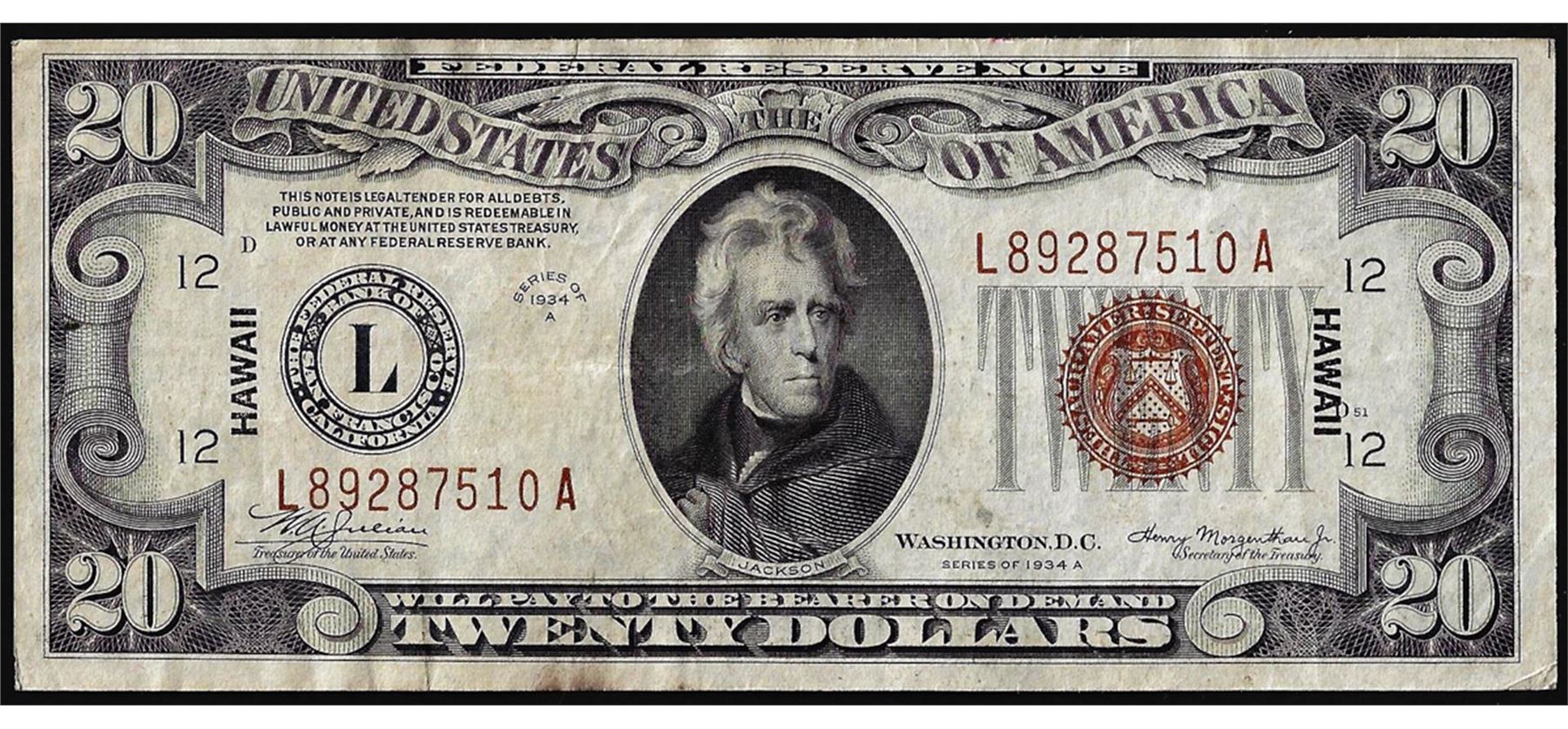 One 1934A $20 Hawaii WWII Emergency Issue Federal Reserve Notes.