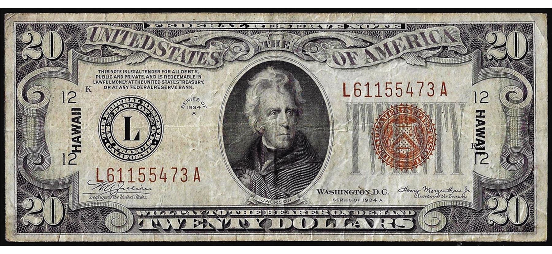 One 1934A $20 Hawaii WWII Emergency Issue Federal Reserve Notes.