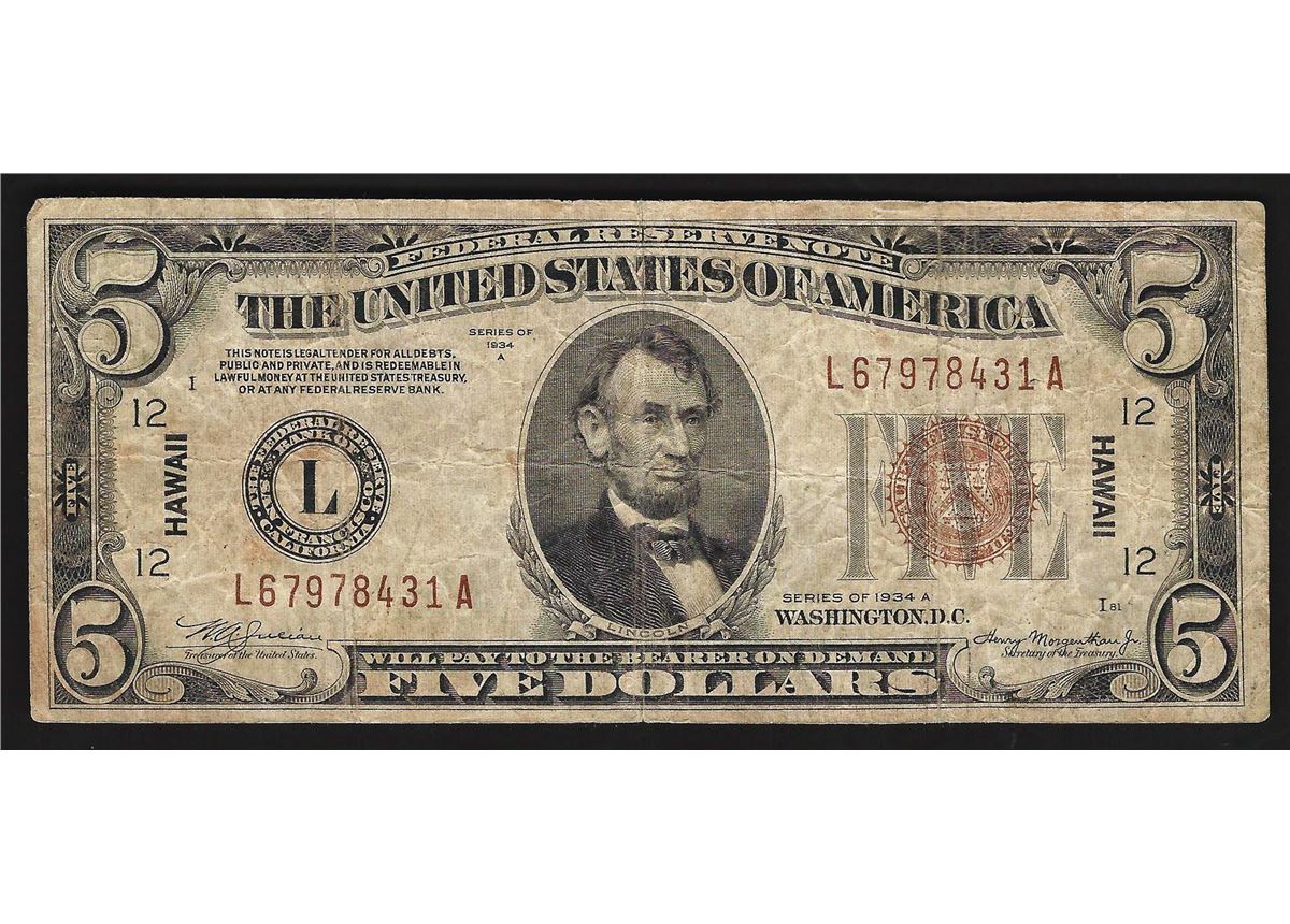One 1934A $5 Federal Reserve Emergency Hawaii Note.