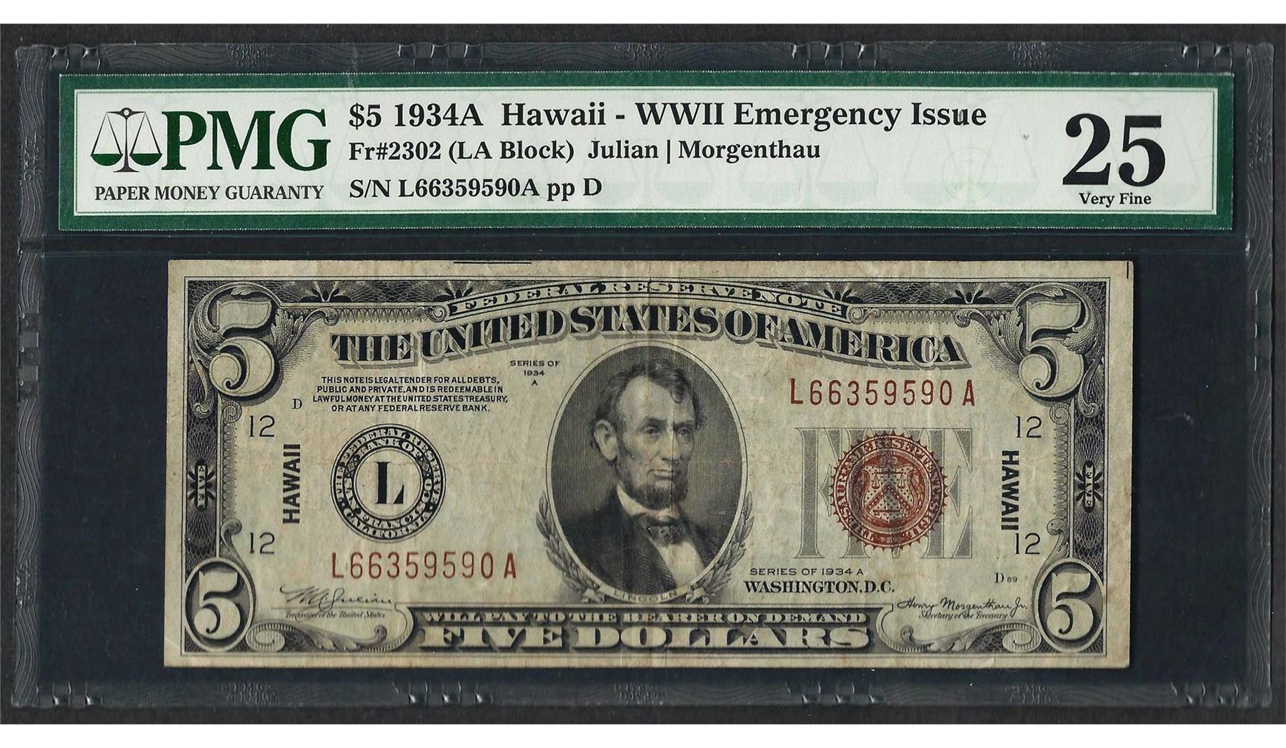 One 1934A $5 Hawaii Federal Reserve WWII Emergency Note Fr.2302 PMG Very Fine 25. PMG Certified.