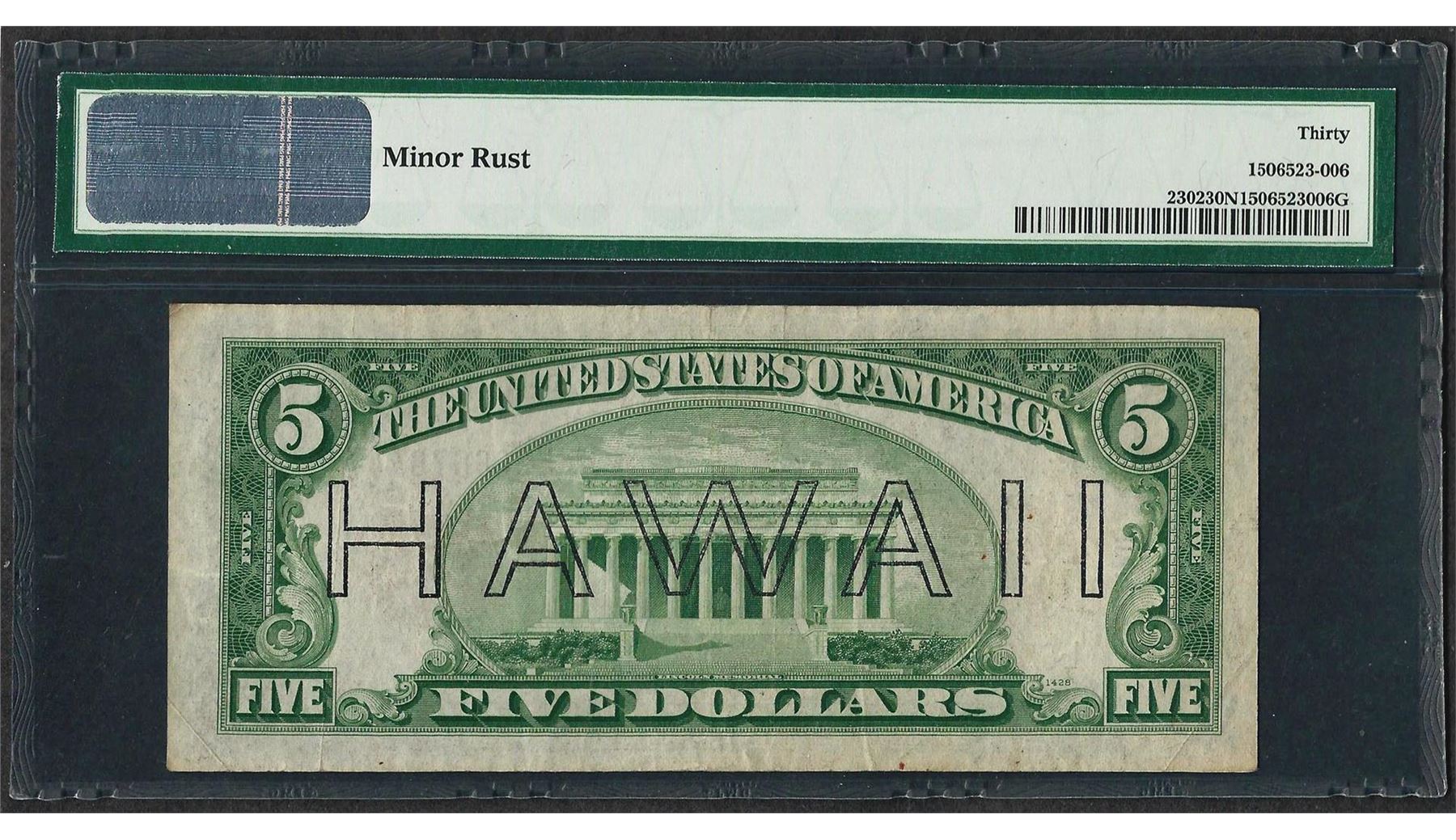 One 1934A $5 Hawaii Federal Reserve WWII Emergency Note Fr.2302 PMG Very Fine 30 Net. PMG Certified.