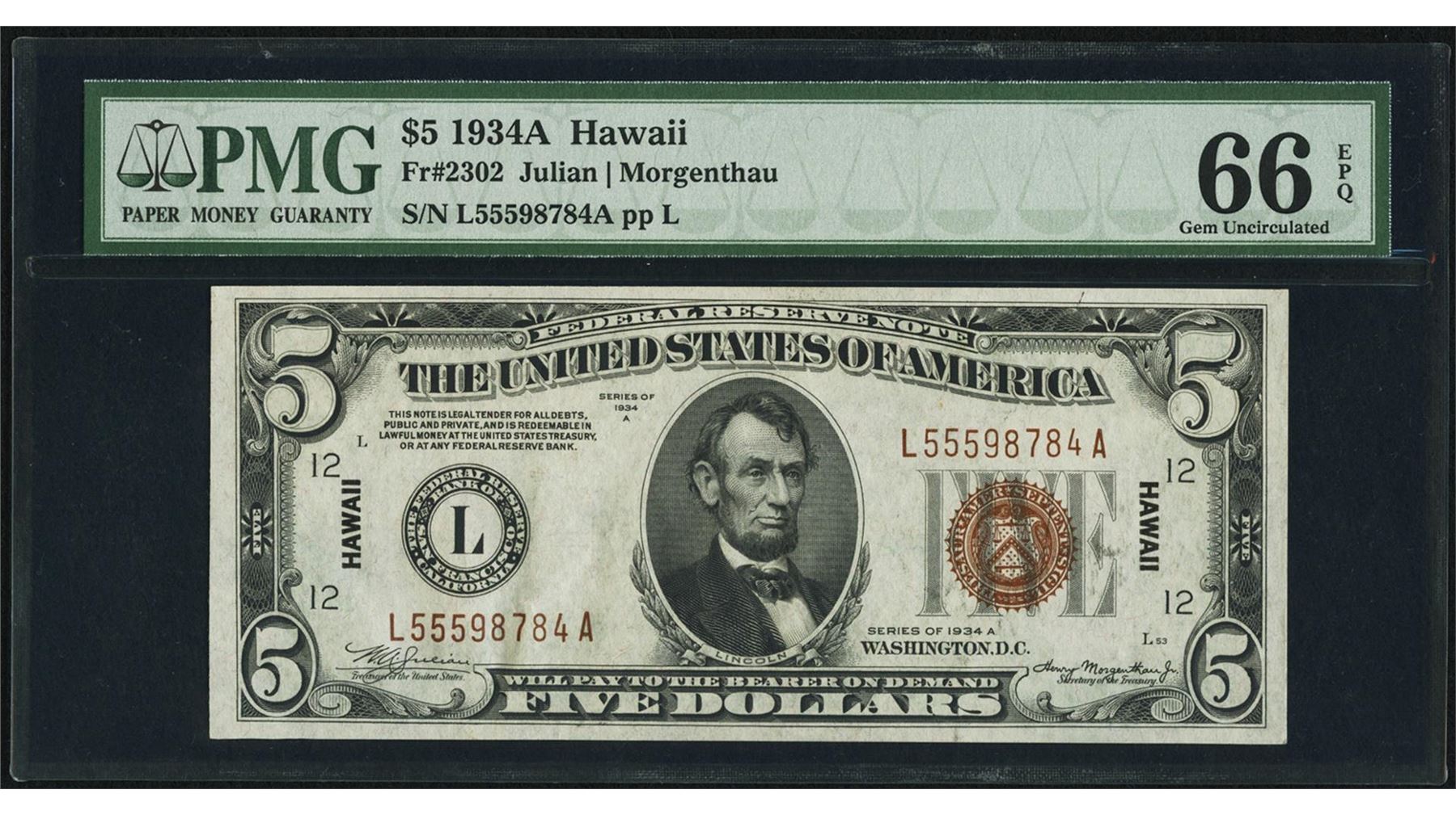 One 1934A $5 Hawaii Federal Reserve WWII Emergency Note PMG Gem Uncirculated 66EPQ. PMG Certified.