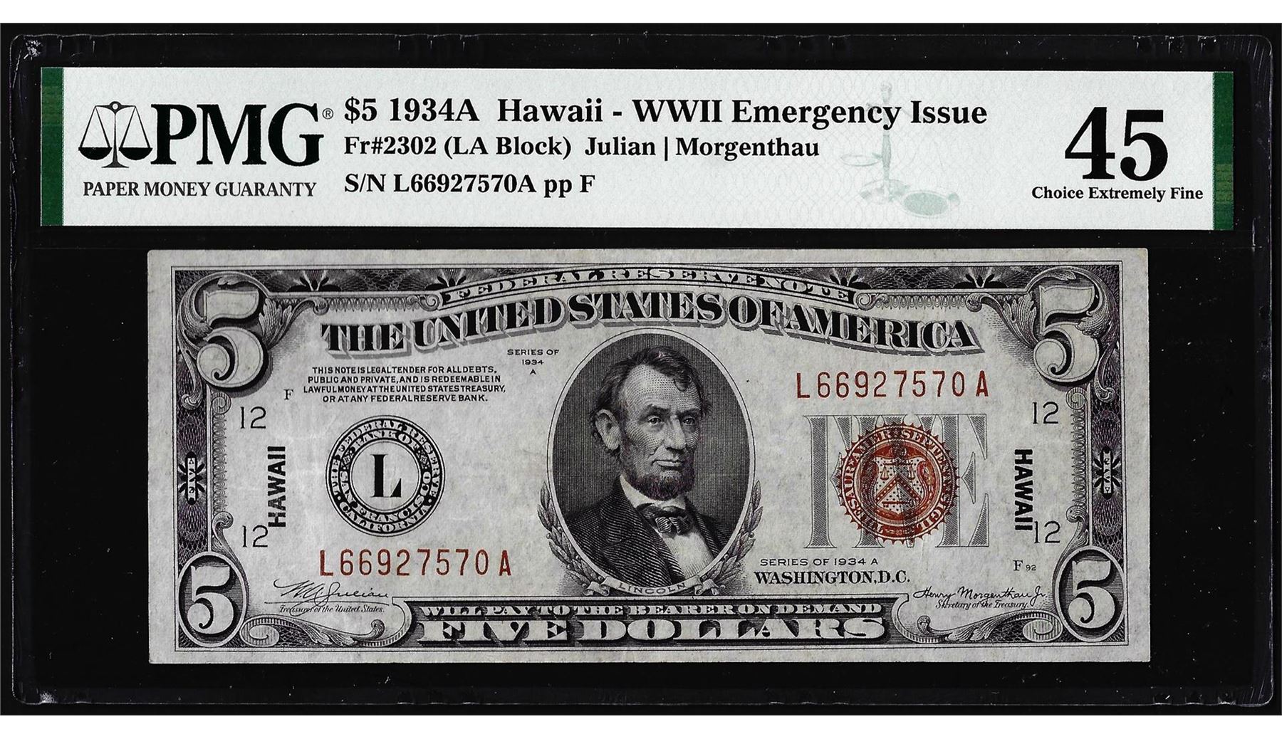 One 1934A $5 Hawaii WWII Emergency Silver Certificate Note PMG Choice Extremely Fine 45. PMG Certified.